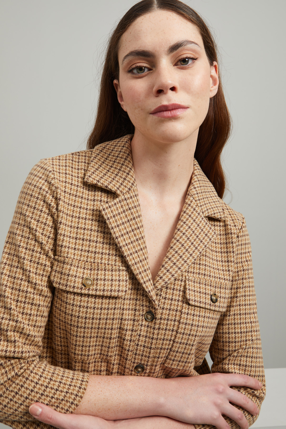 Tuta corta dalla linea dritta realizzata in jersey di misto cotone con lavorazione jacquard , collo a rever, maniche a tre quarti, tasche con patta applicate al petto e inserite in cucitura sui fianchi. Allacciatura tramite bottoni a vista.