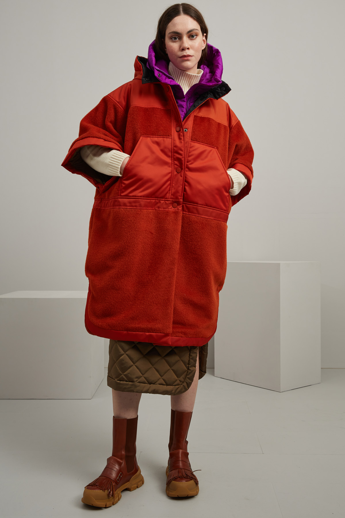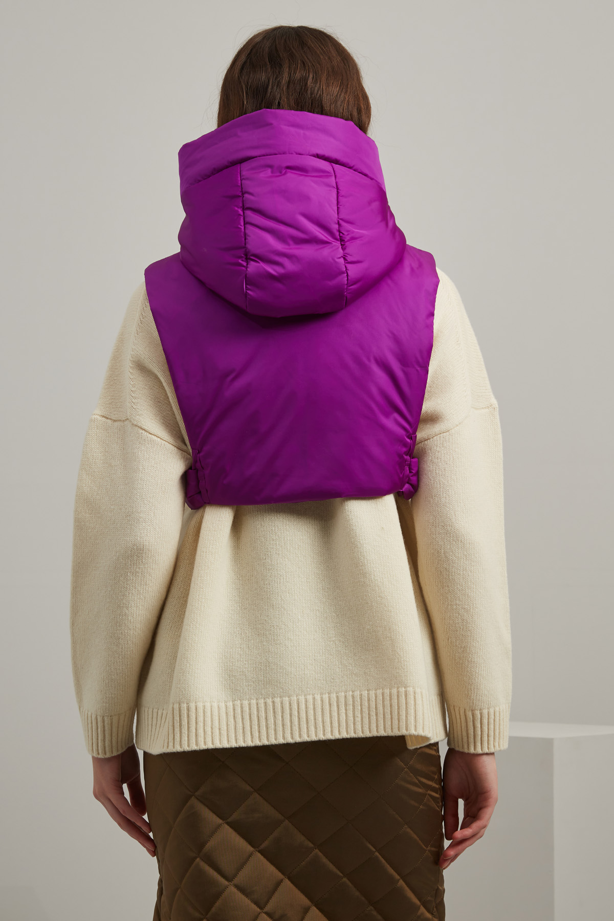 Gilet imbottito corto dalla linea dritta realizzato in raso tecnico, con cappuccio e coulisse, aperture laterali con cinturino regolabile e allacciatura nascosta tramite zip e bottoni automatici.