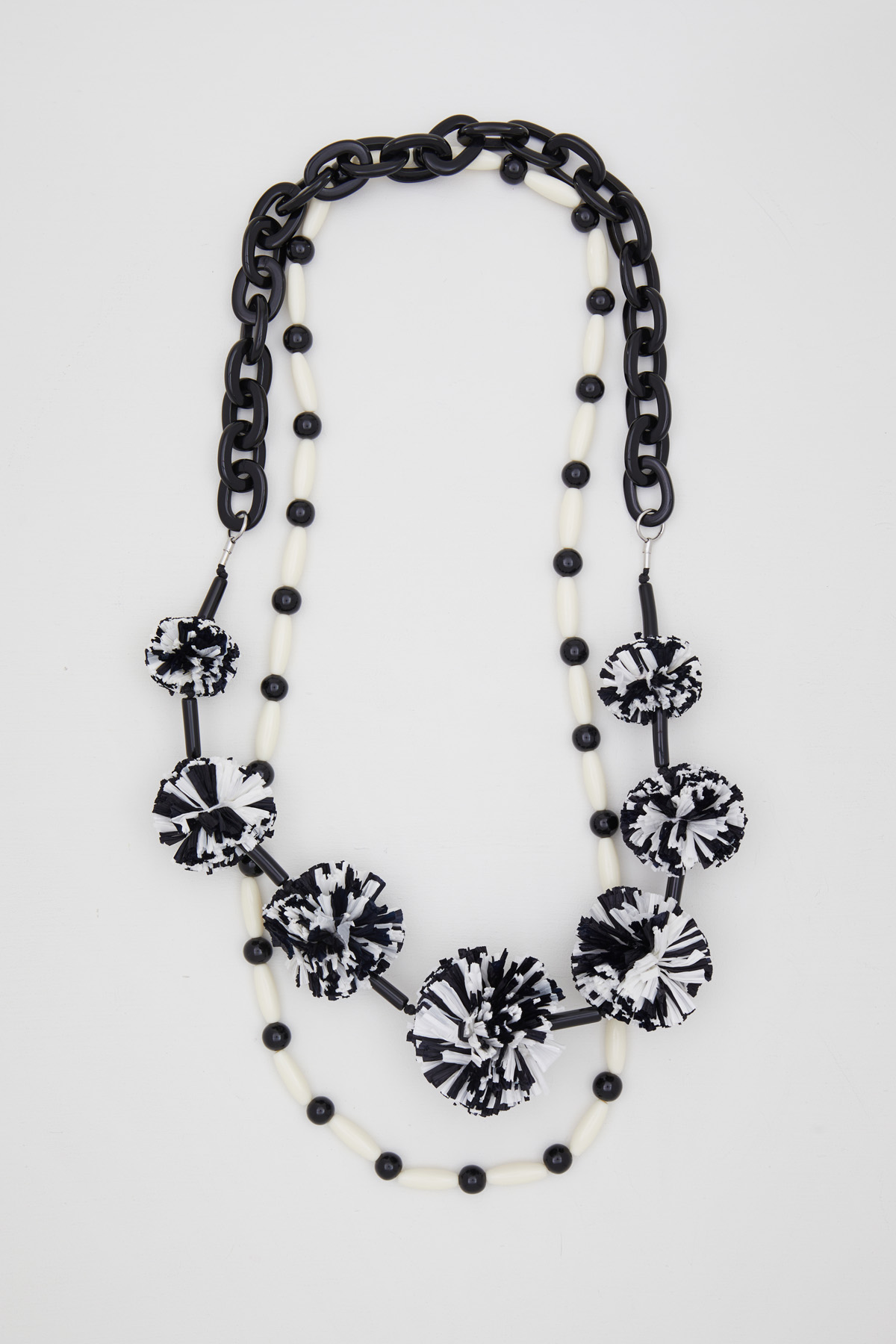 Collana doppia realizzata in resina e rafia di misto viscosa, con elementi a catena, perline e pon pon.