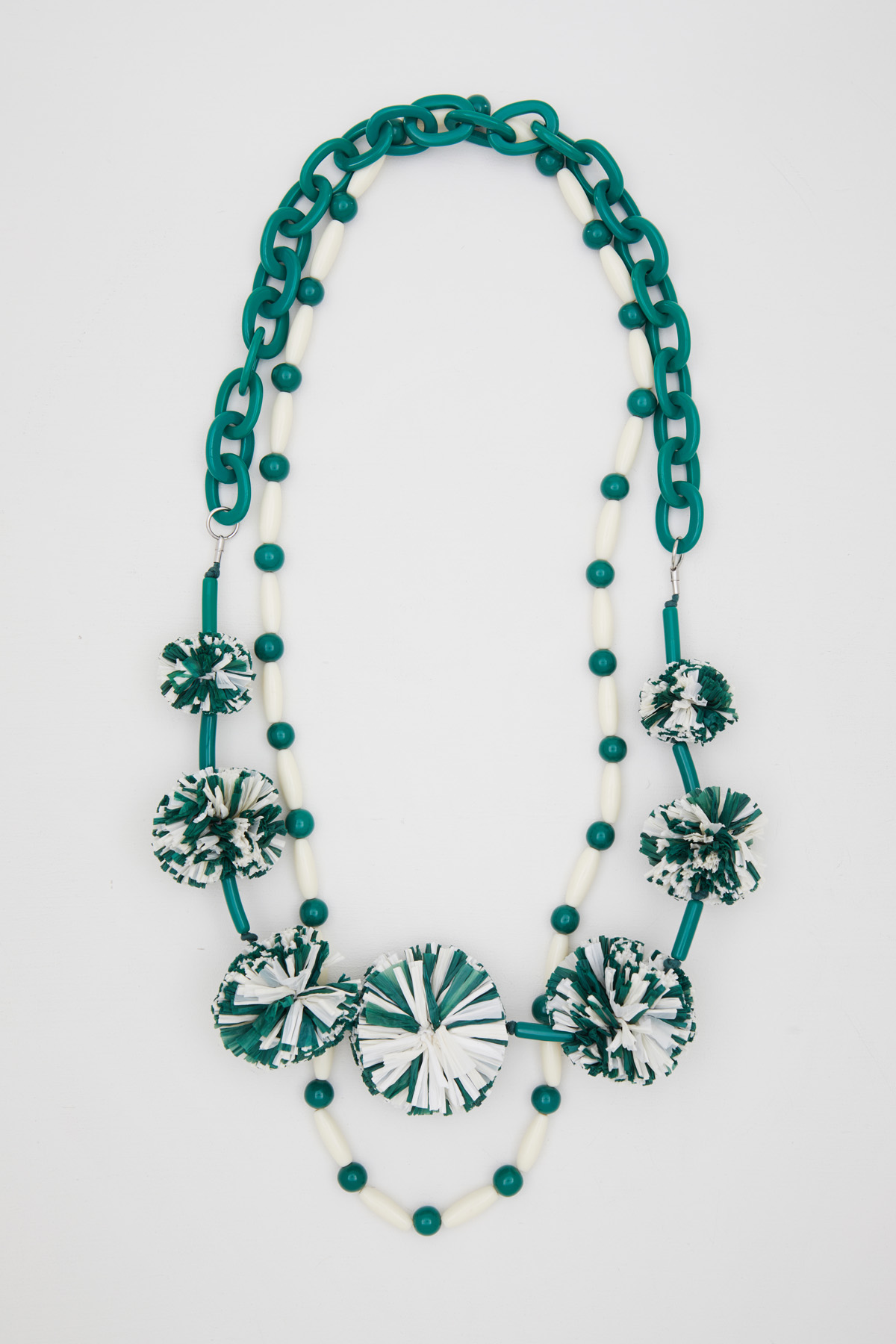 Collana doppia realizzata in resina e rafia di misto viscosa, con elementi a catena, perline e pon pon.