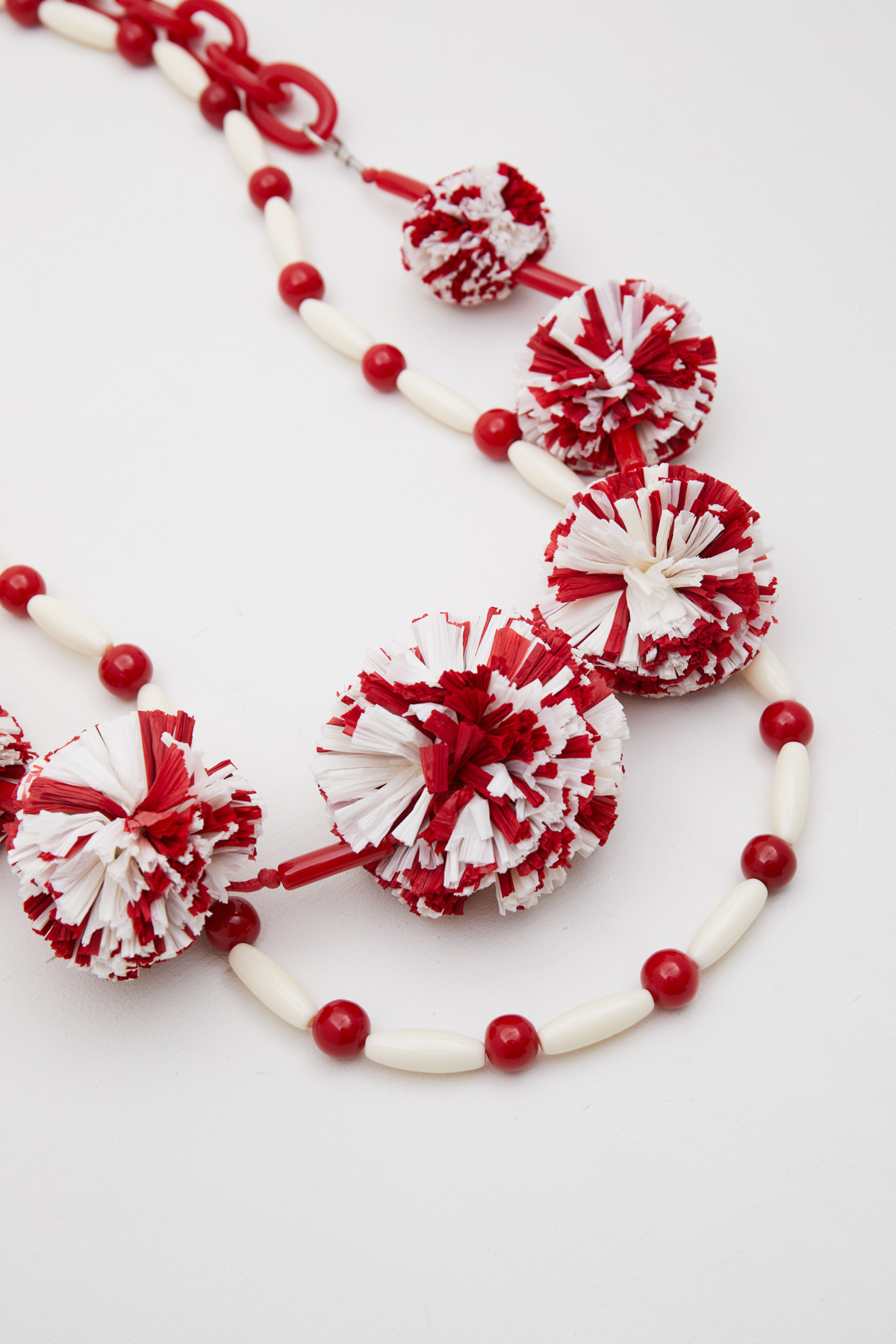 Collana doppia realizzata in resina e rafia di misto viscosa, con elementi a catena, perline e pon pon.
