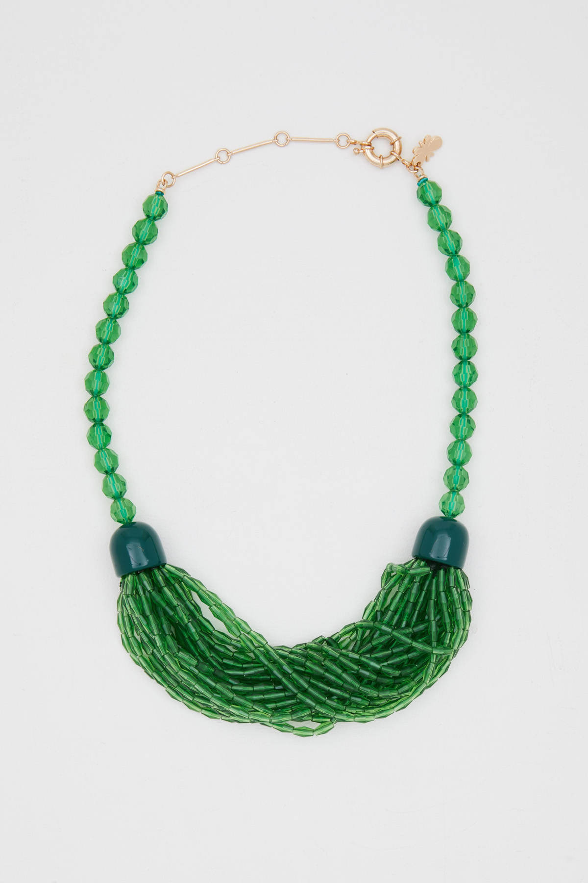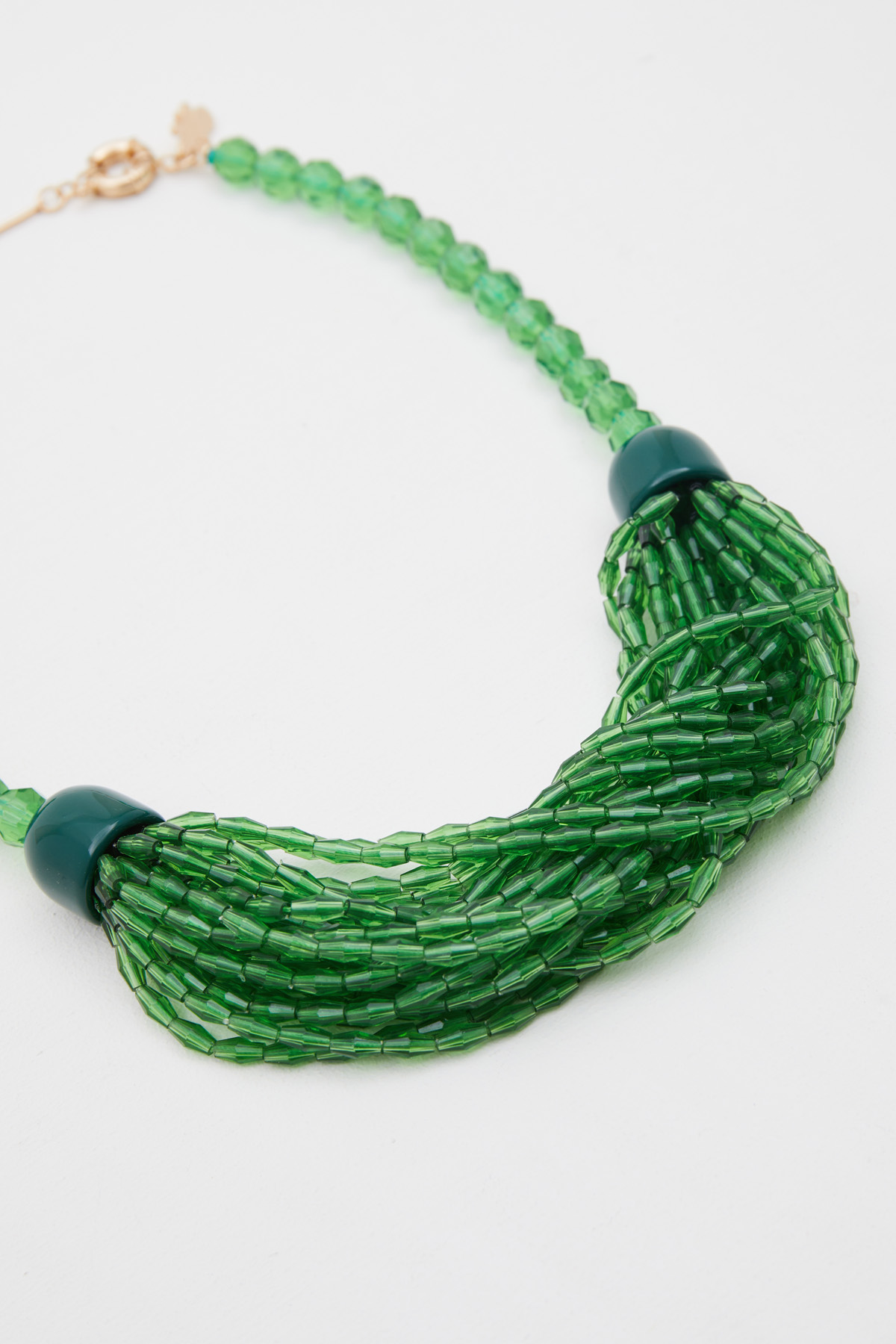 Collana girocollo multifilo realizzata in resina con perline sfaccettate e dettagli in metallo. Chiusura tramite gancio.