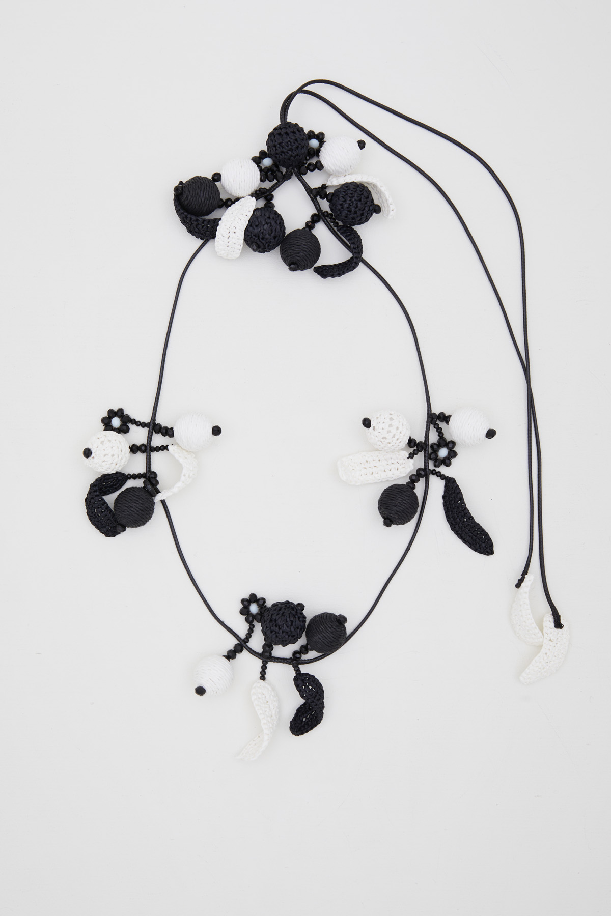 Collana lunga realizzata in rafia e resina, con elementi pendenti a sfera, dettagli intrecciati, cordino e perline sfaccettate. Chiusura a scorrimento.