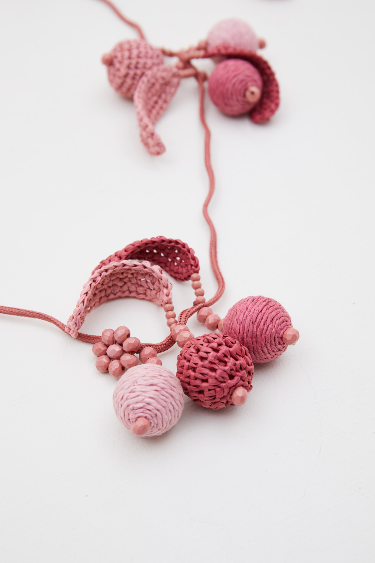Collana lunga realizzata in rafia e resina, con elementi pendenti a sfera, dettagli intrecciati, cordino e perline sfaccettate. Chiusura a scorrimento.