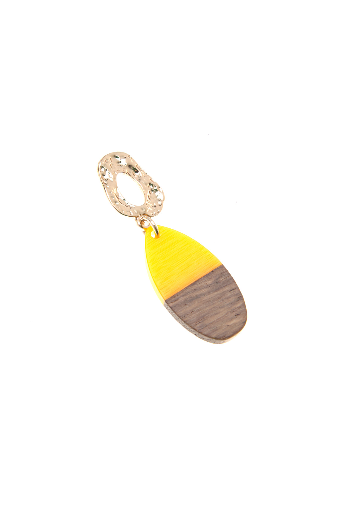 Orecchini pendenti realizzati in metallo, resina e legno, con dettagli geometrici e chiusura a farfallina.