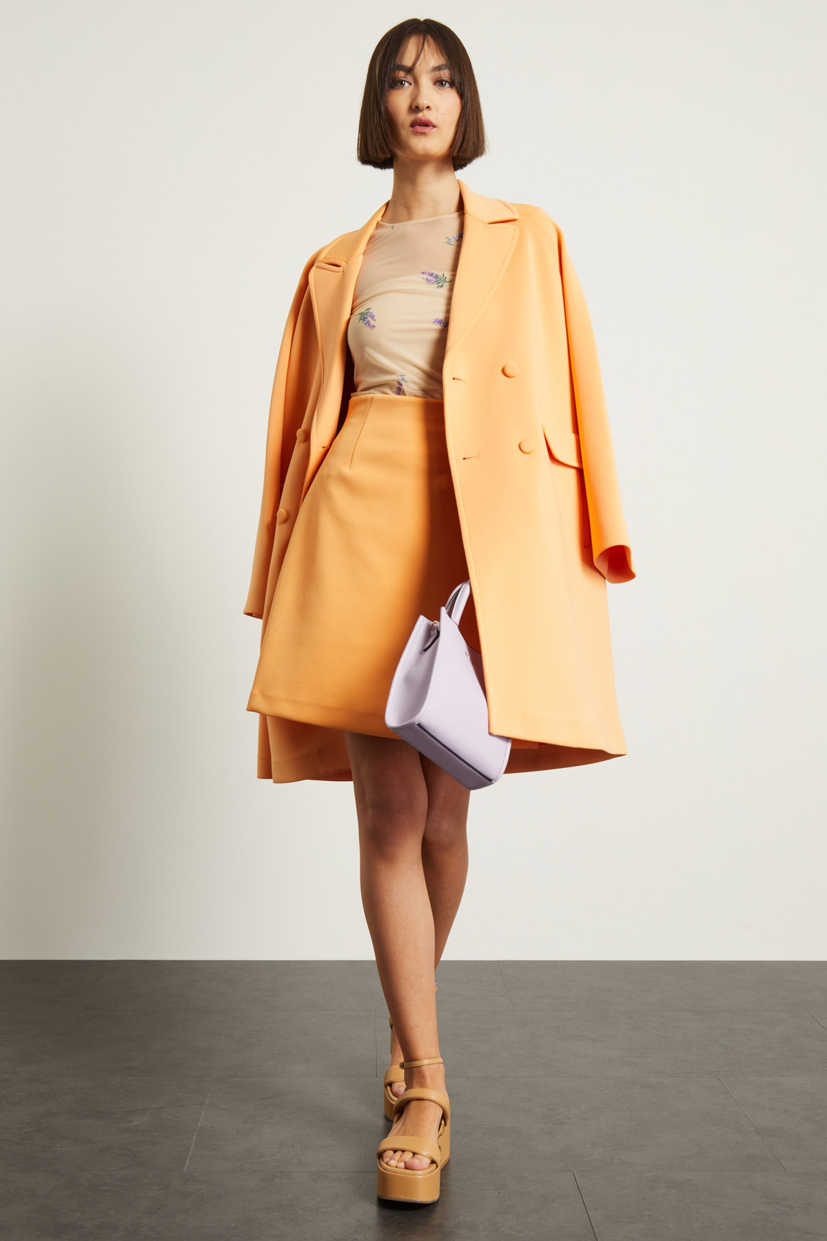 Gonna corta dalla linea ad A realizzata in jersey compatto di misto cotone stretch con allacciatura tramite zip invisibile nel retro. Sfoderata.