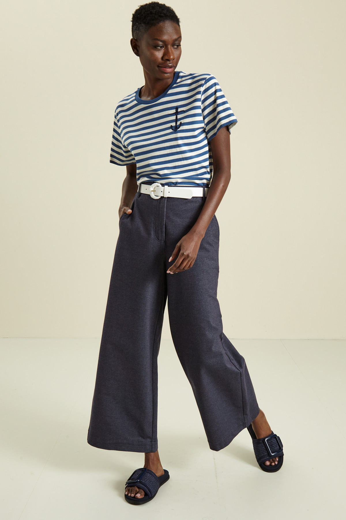 Pantaloni dalla linea ampia realizzati in jersey di cotone stretch effetto denim, con passanti in vita, tasche laterali alla francese sul davanti e applicate nel retro, allacciatura nascosta tramite zip, bottone e gancio.