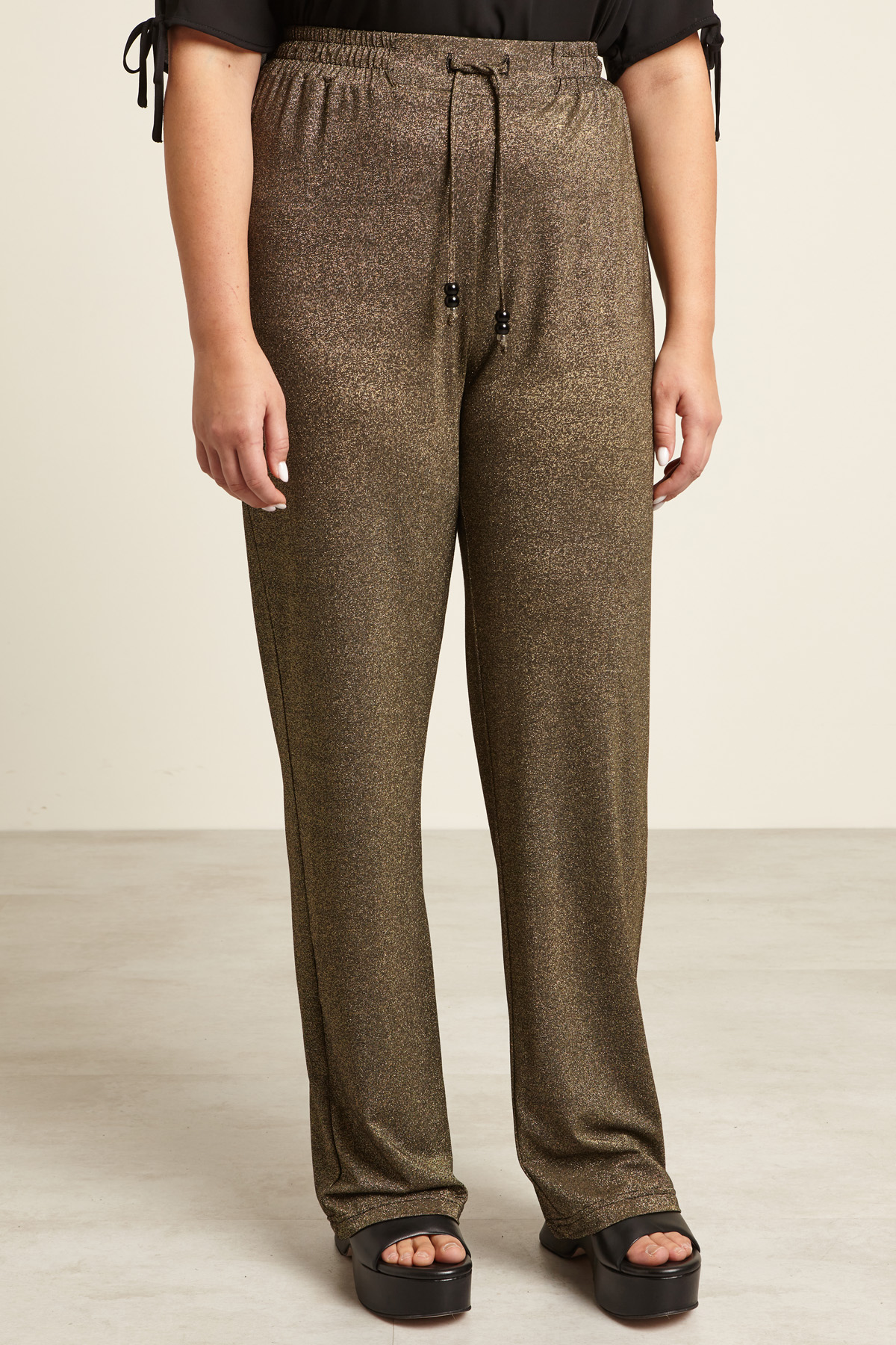 Pantaloni dalla linea ampia in jersey lamè, con elastico in vita e coulisse rifinite da perline al fondo.