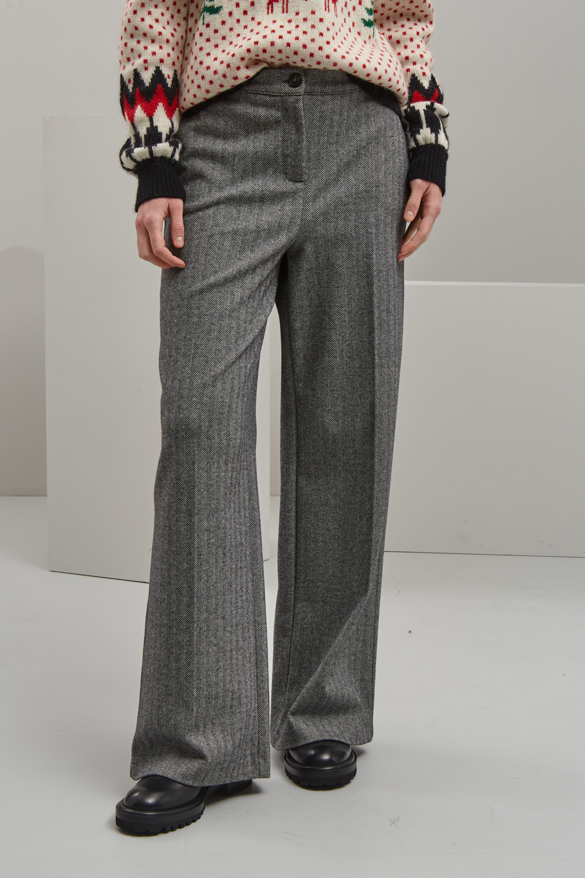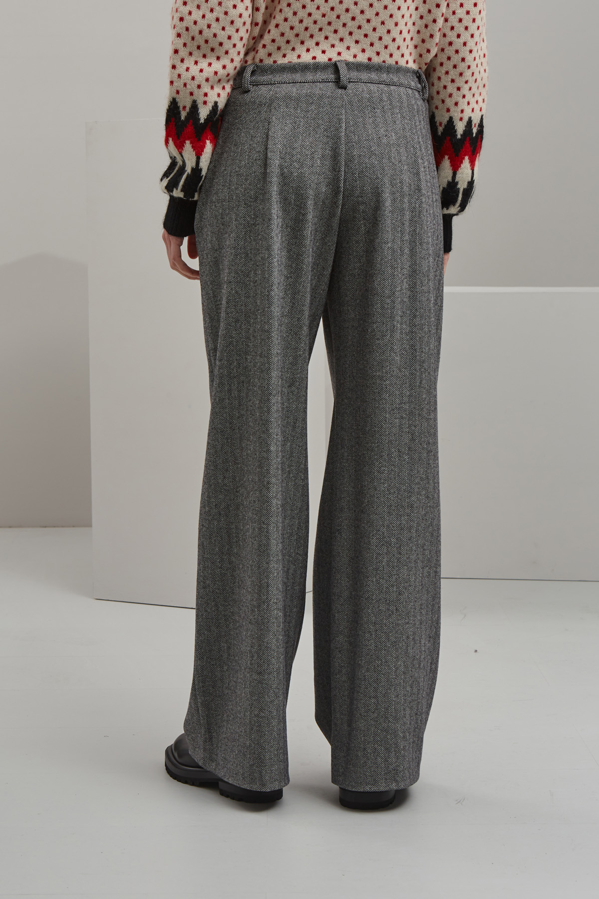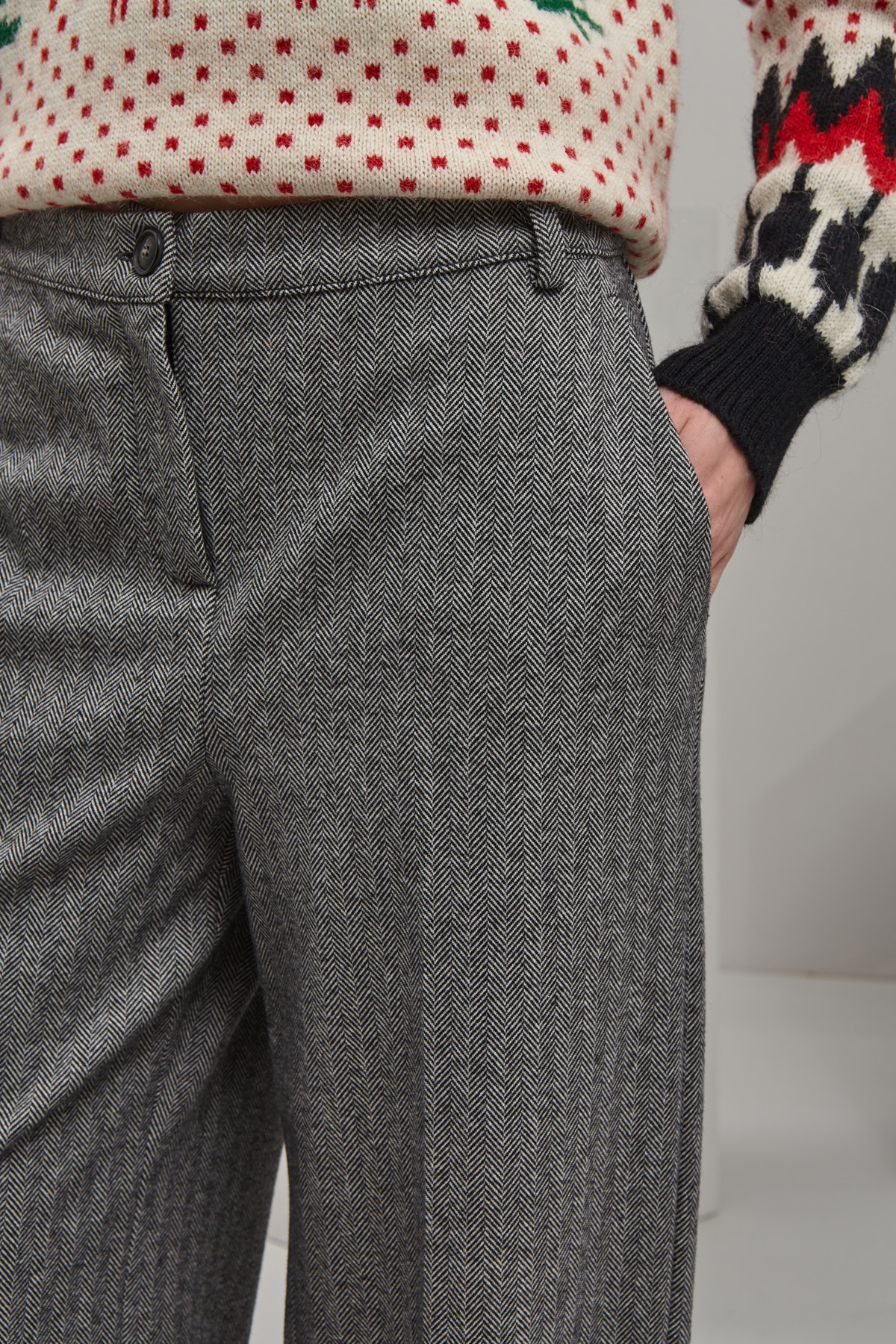 Pantaloni dalla linea dritta realizzati in jersey di misto cotone stretch jacquard, con passanti in vita tasche alla francese sul davanti e pinces nel retro. Allacciatura tramite zip nascosta e bottone.
