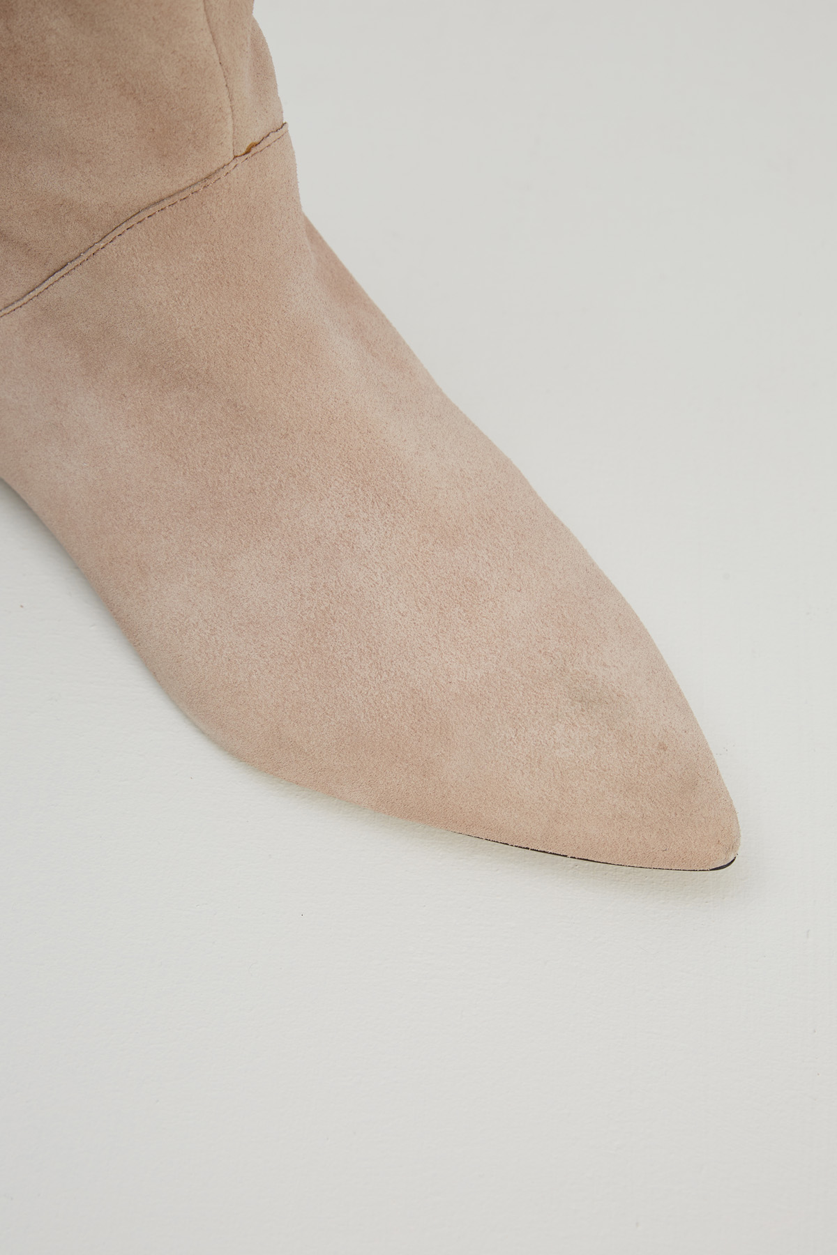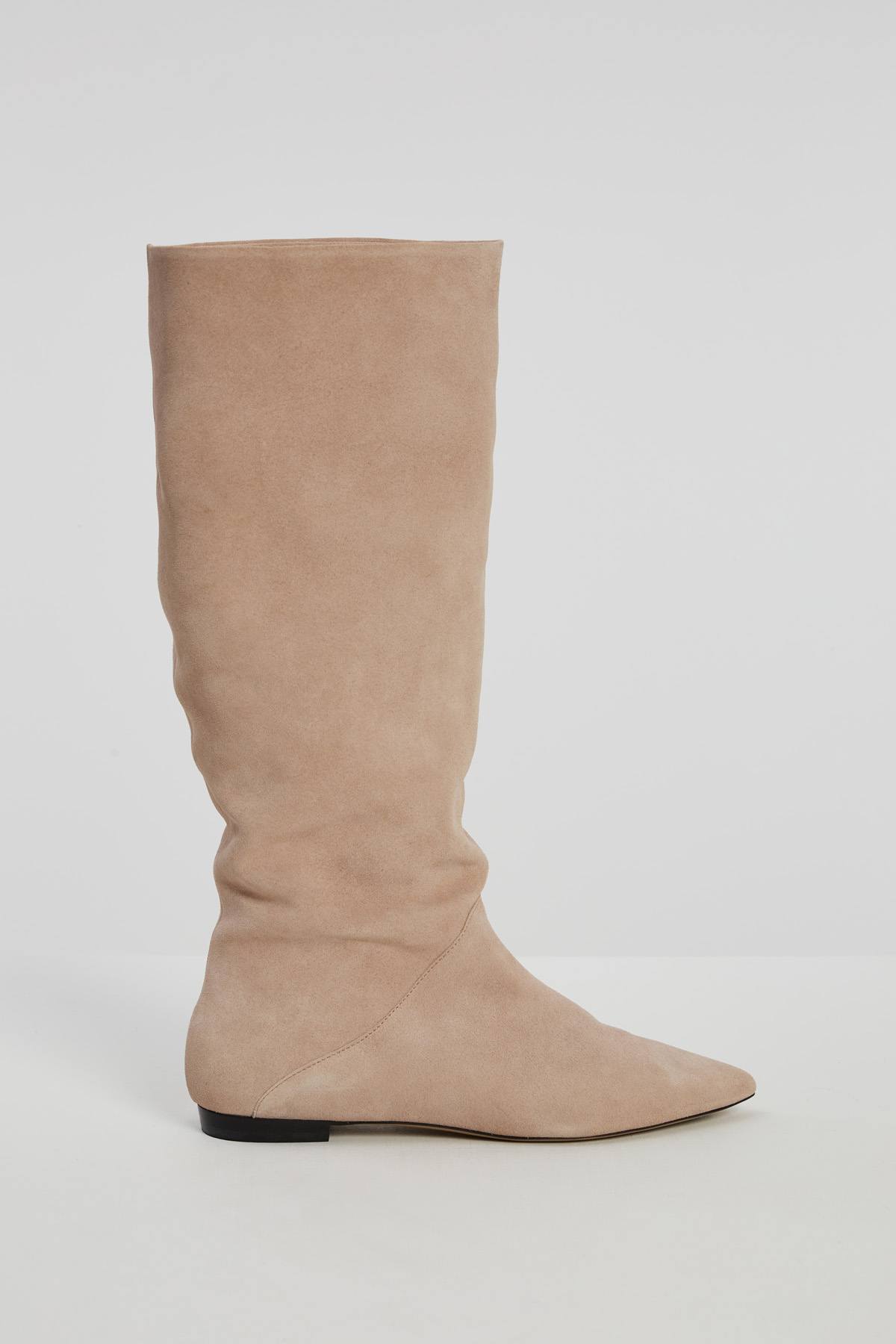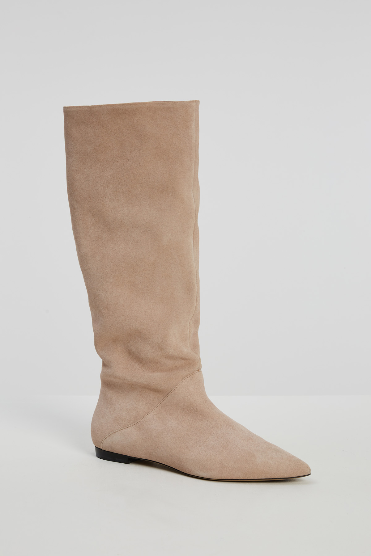 Stivali alti realizzati in vera pelle scamosciata, con punta affusolata e suola in cuoio.