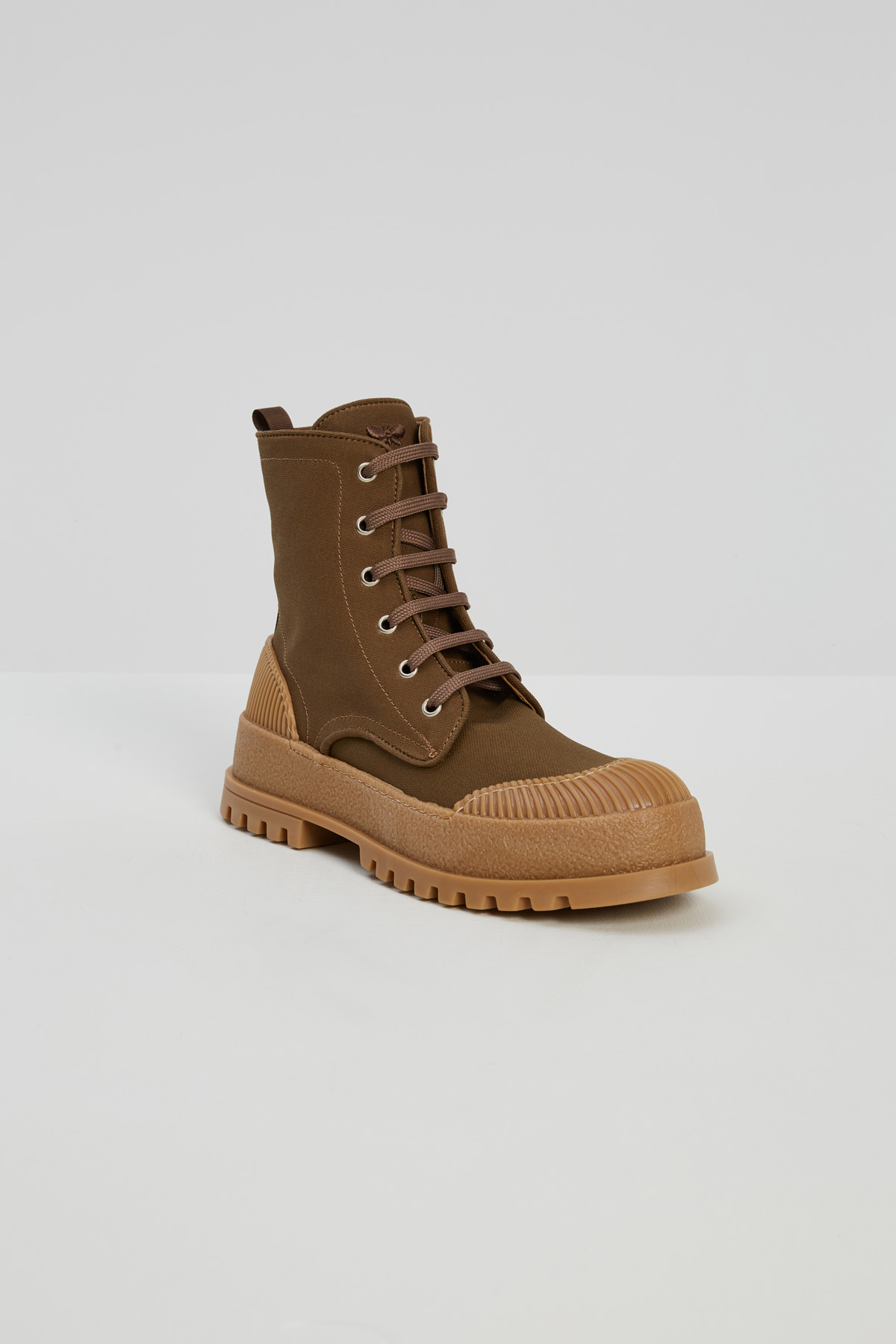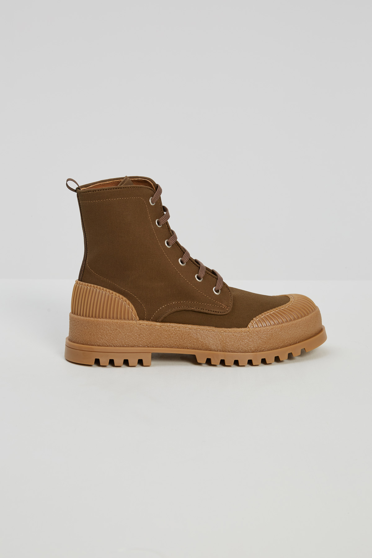 Anfibi realizzati in tela spessa di puro cotone, con punta arrotondata e chiusura tramite lacci. Fodera in pelle e suola in gomma.