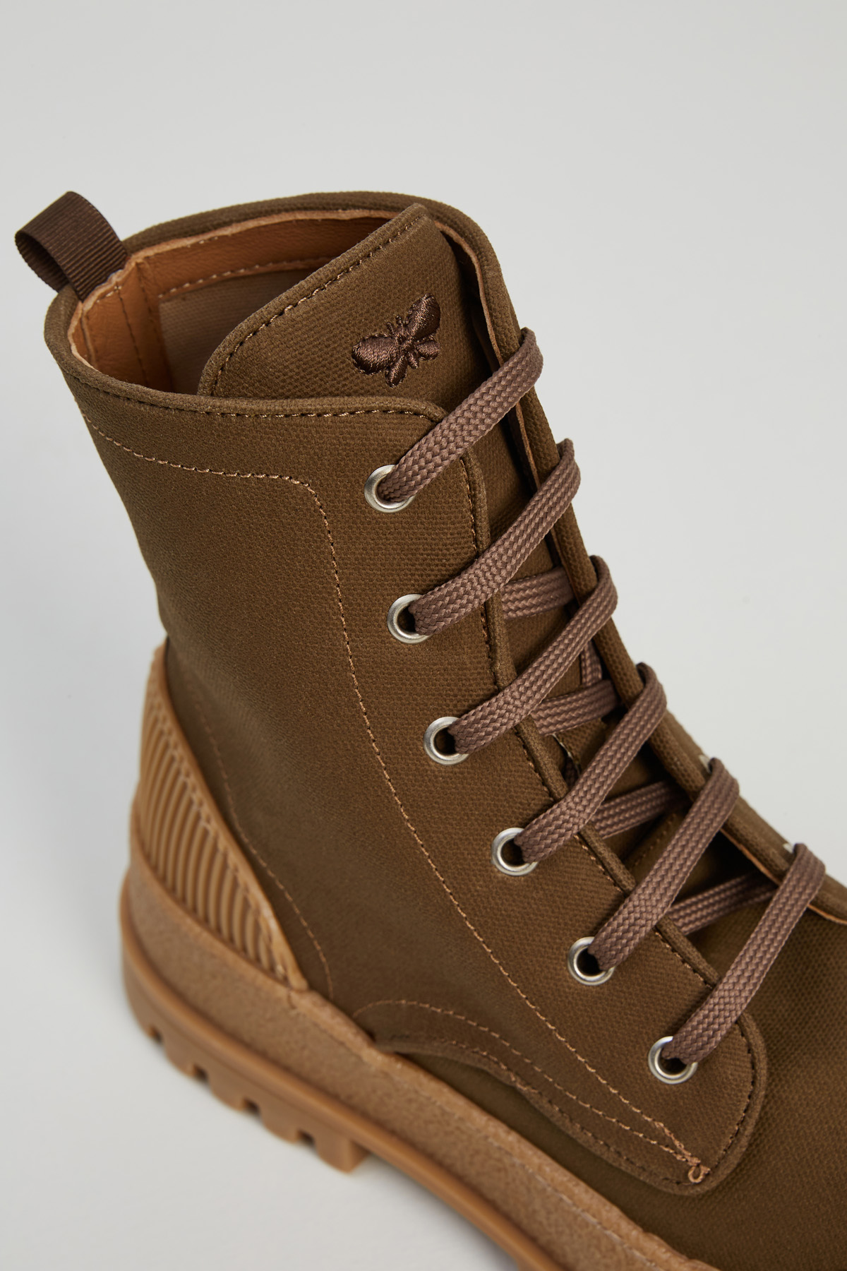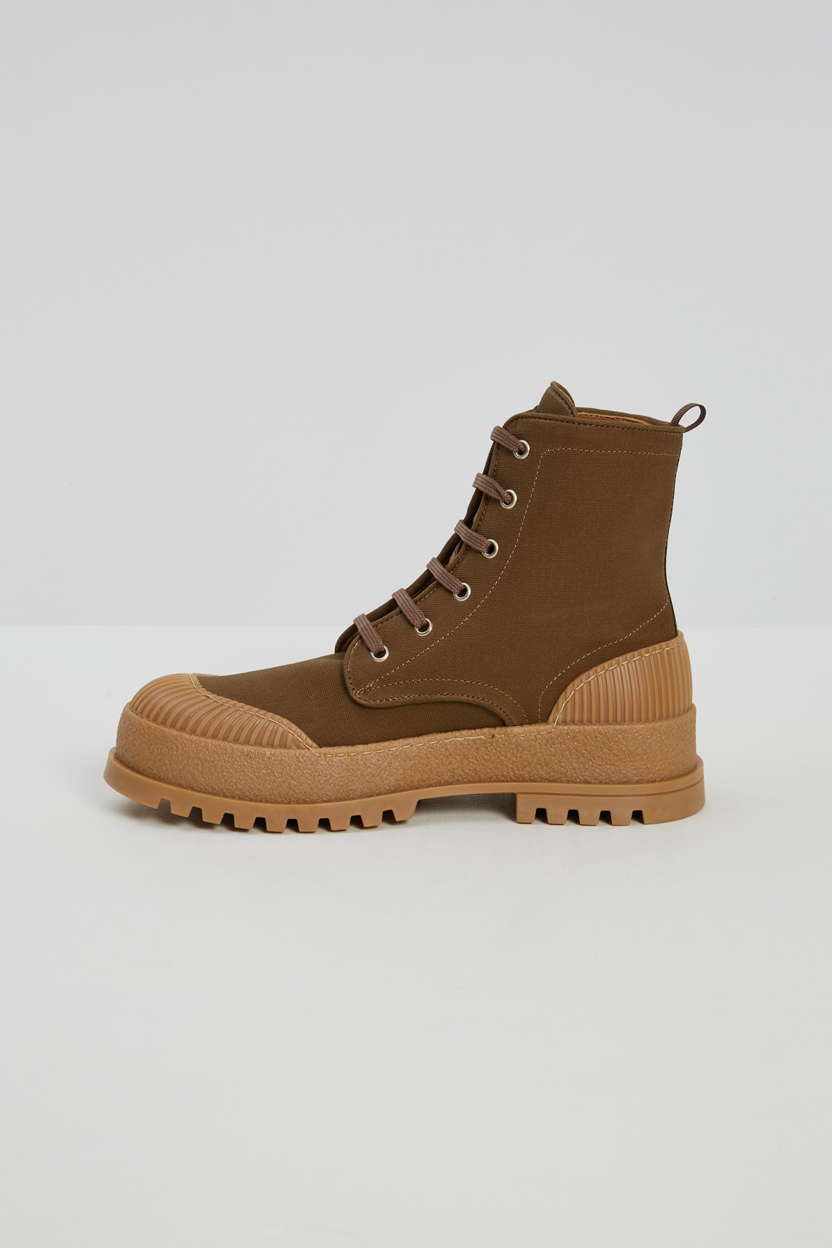 Anfibi realizzati in tela spessa di puro cotone, con punta arrotondata e chiusura tramite lacci. Fodera in pelle e suola in gomma.