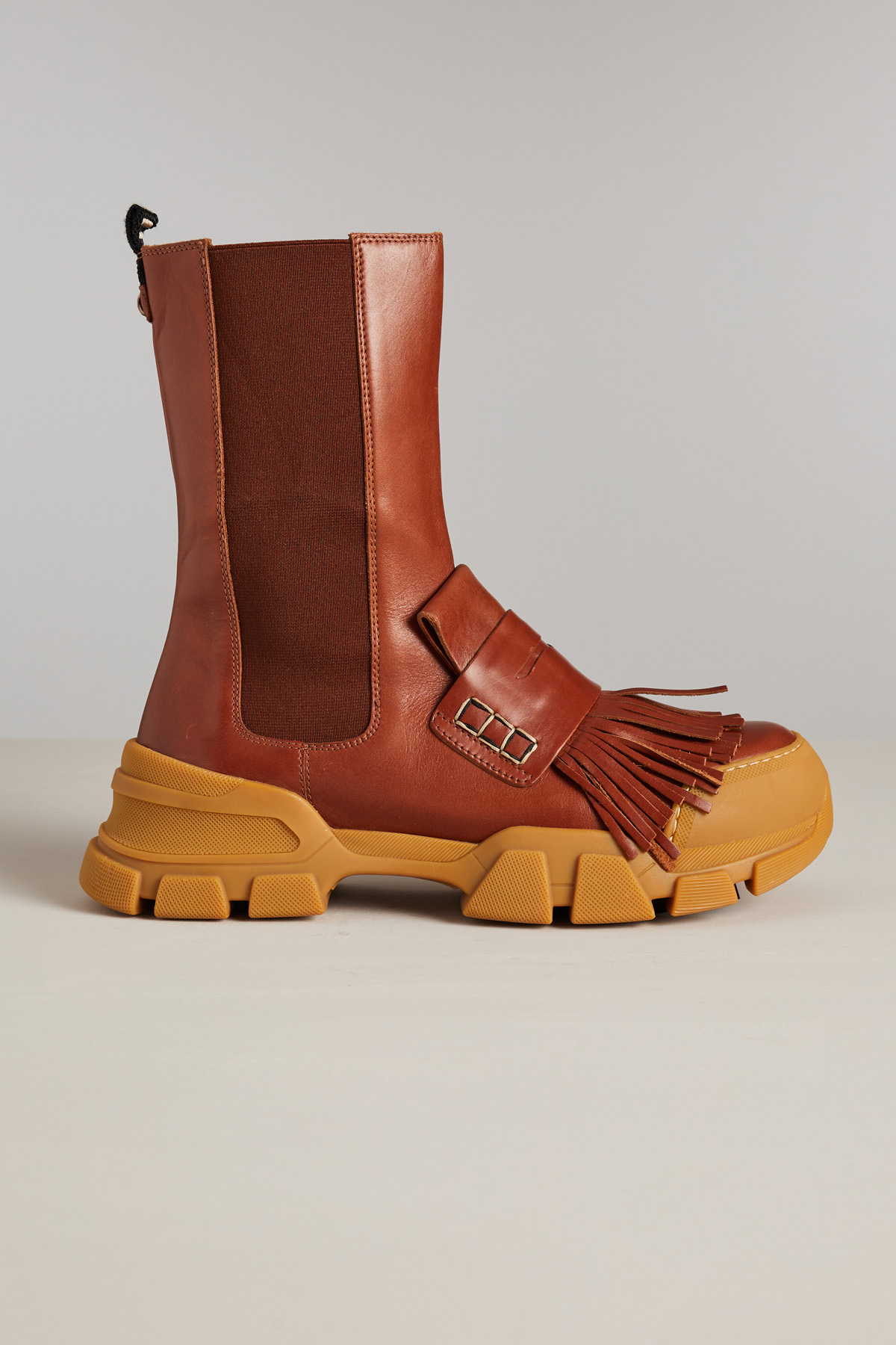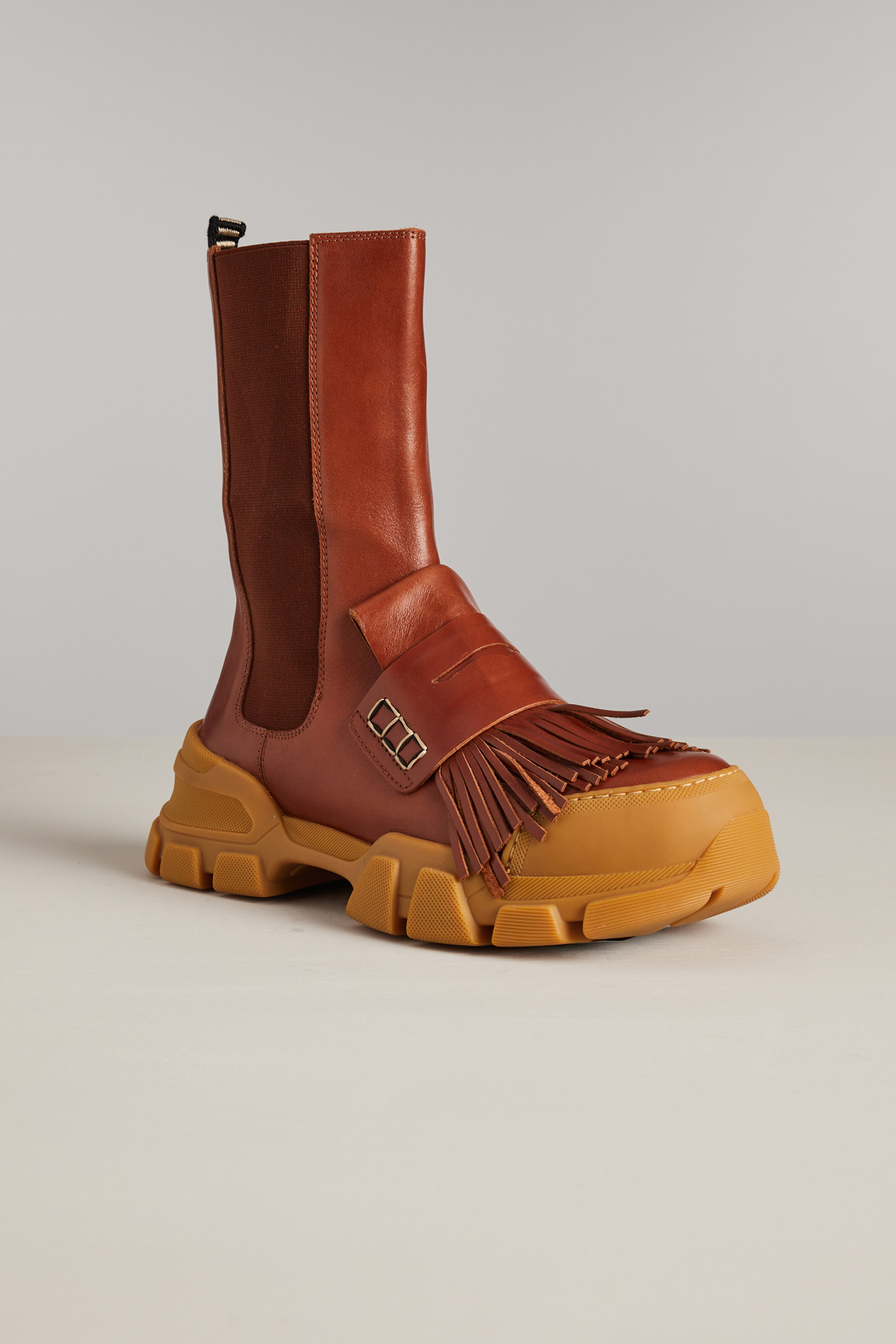 Stivaletti realizzati in vera pelle con inserti elastici sui lati, dettaglio di fascia con frange sul davanti, punta arrotondata. Fodera in pelle e suola trekking in gomma.