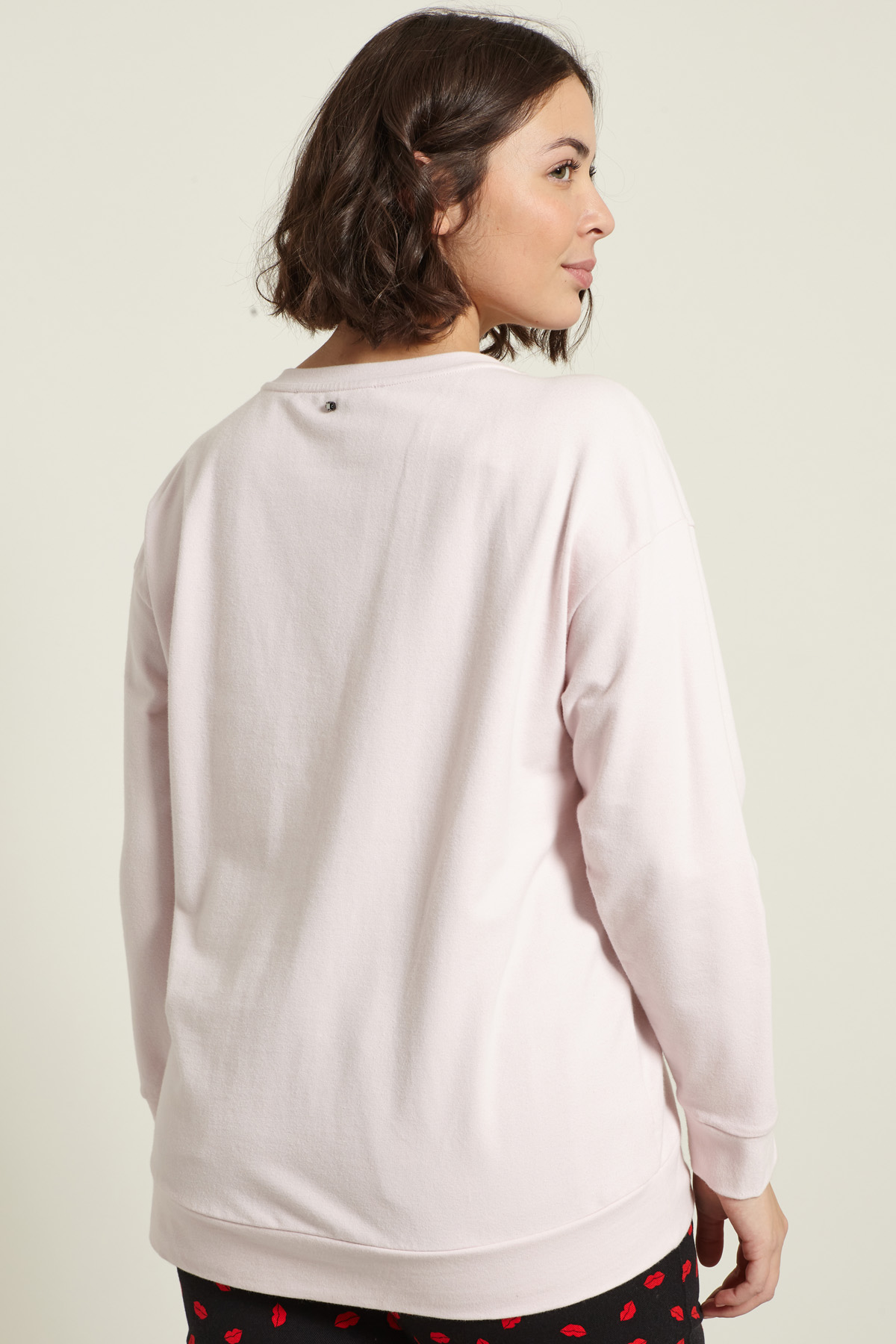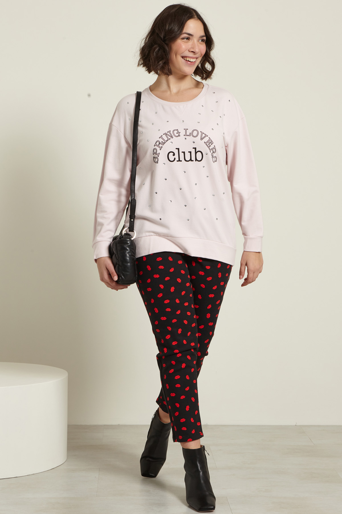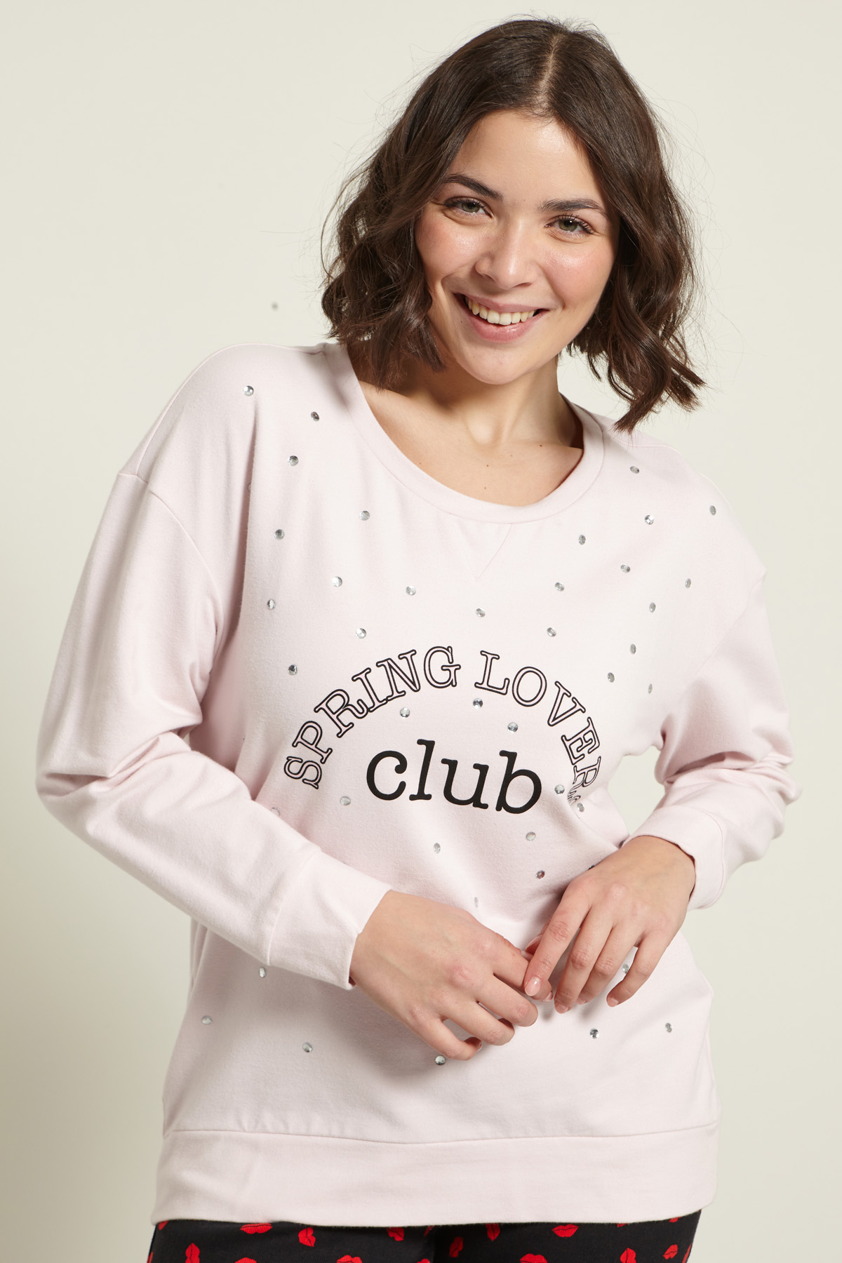 Felpa dalla linea regolare realizzata in jersey spesso di cotone stretch, con motivo di strass e borchie applicate, dettaglio stampato, scollo rotondo e maniche lunghe dal giro sceso.