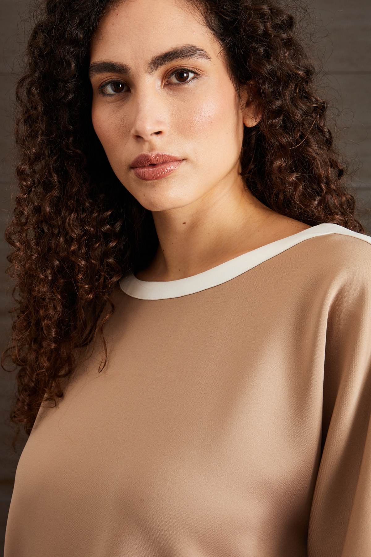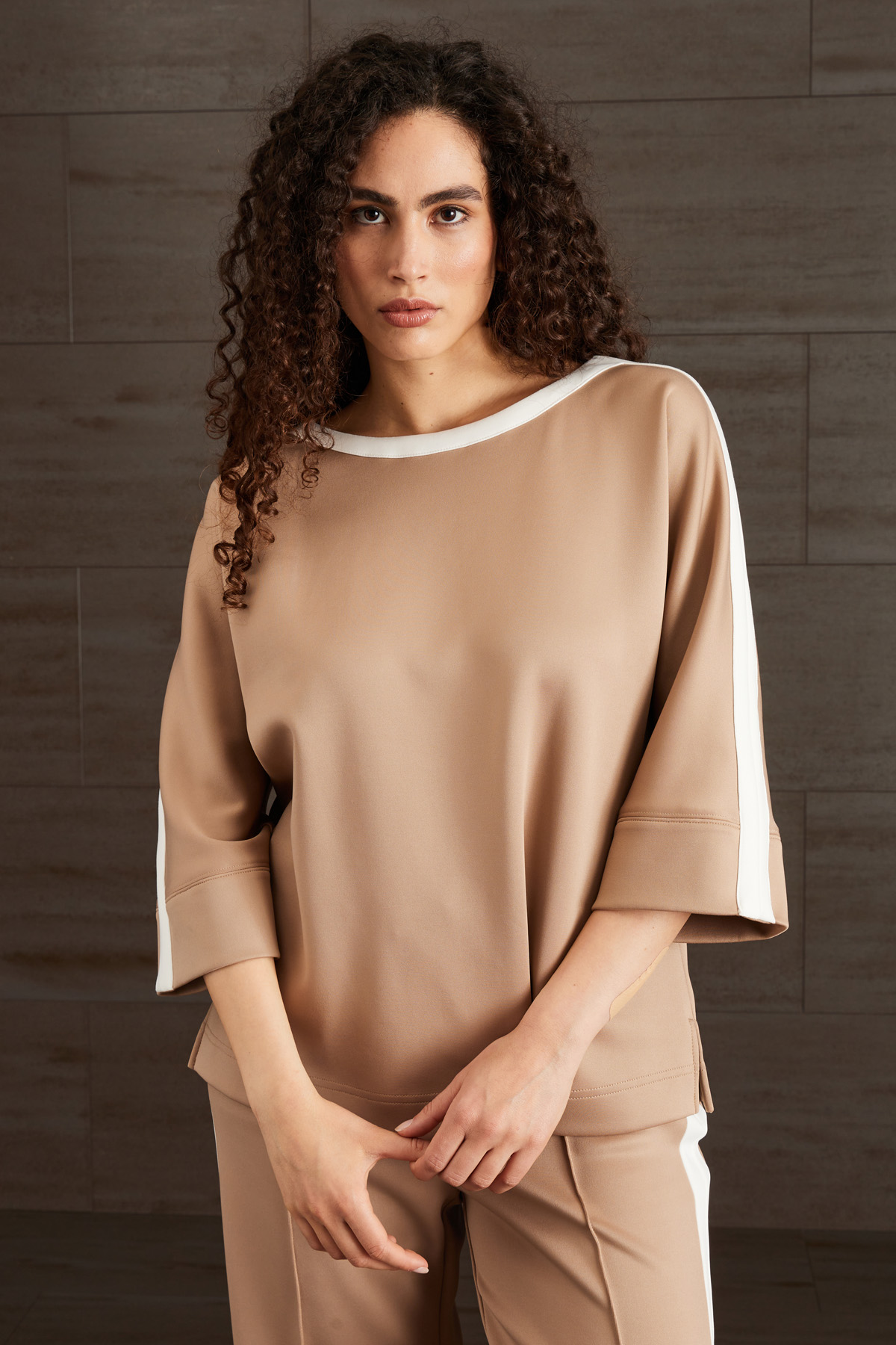 Top dalla linea dritta realizzato in jersey compatto stretch, con scollo rotondo, maniche tre quarti a kimono, spacchetti al fondo e profili rifiniti a contrasto.