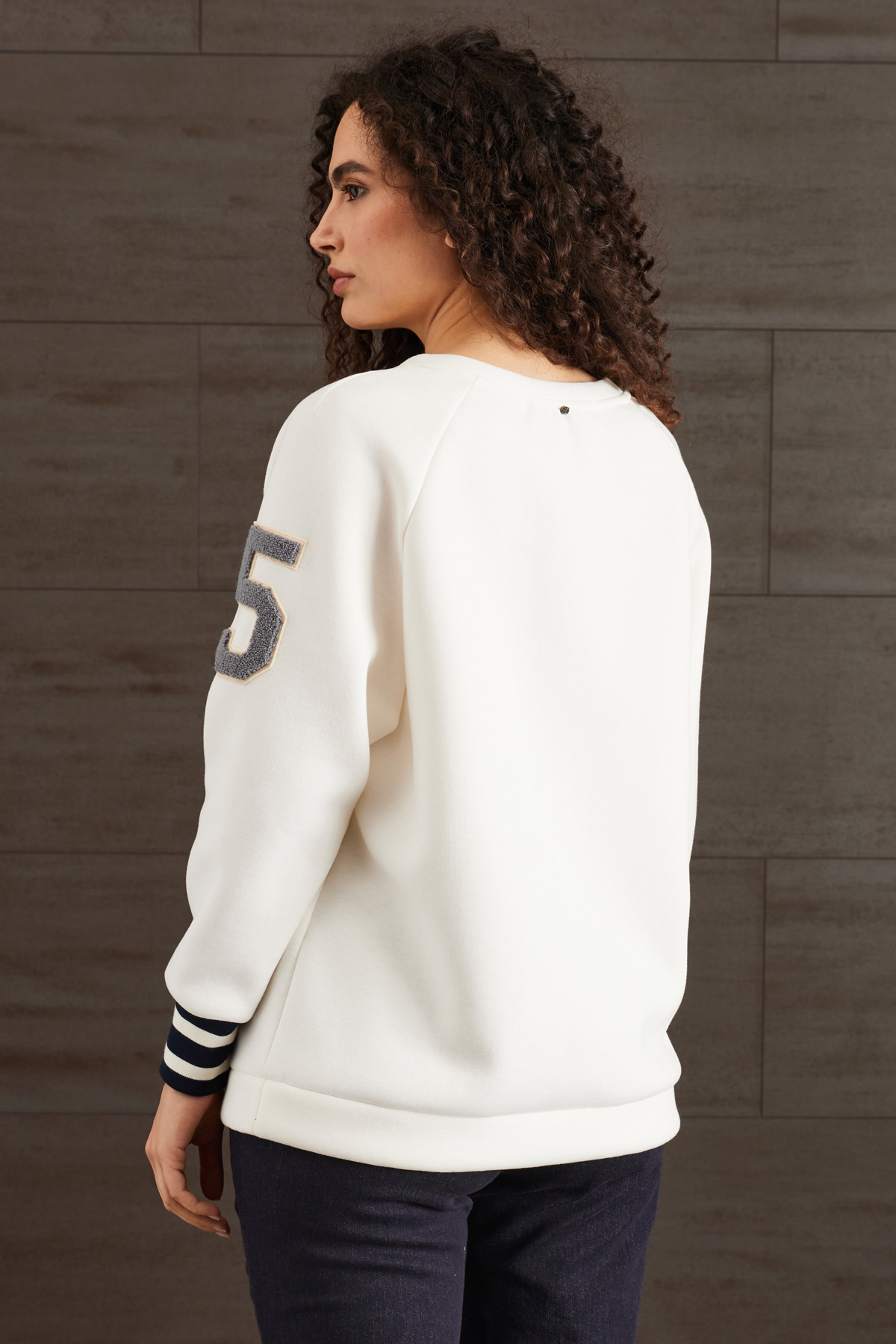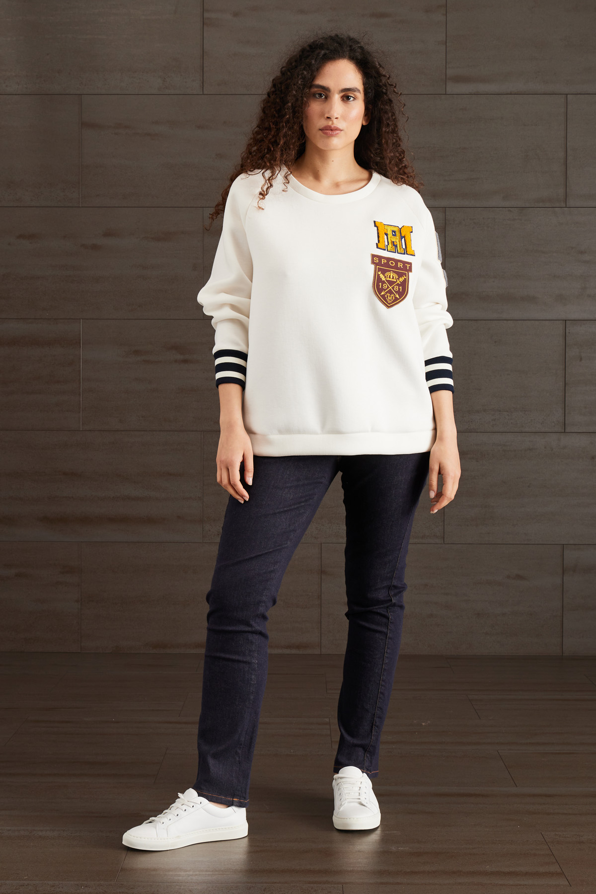 Felpa dalla linea dritta realizzata in jersey compatto di misto viscosa stretch, con scollo a giro, maniche lunghe raglan con polsini in maglia e dettagli i patch applicate al petto.