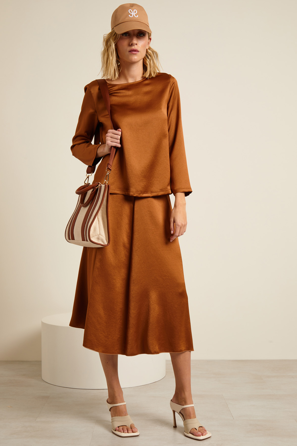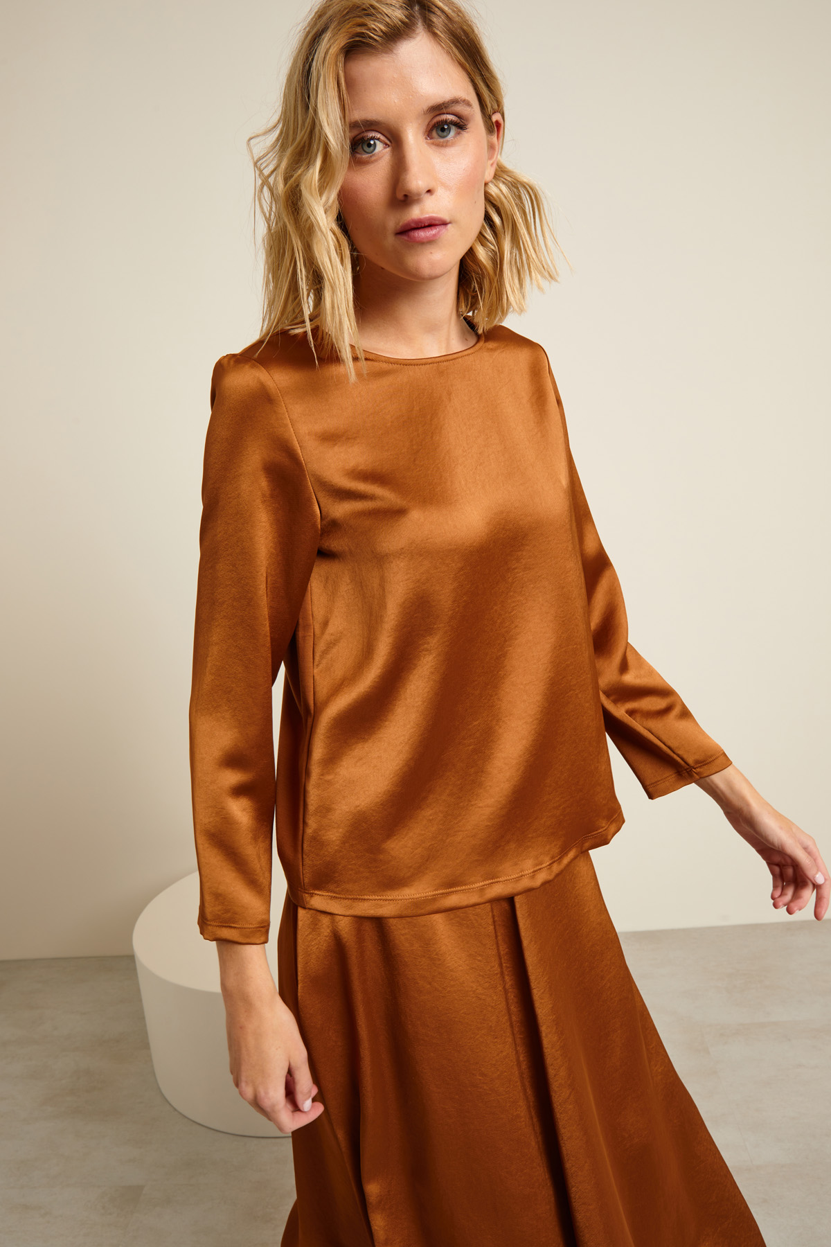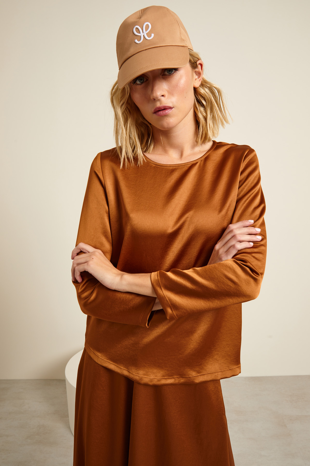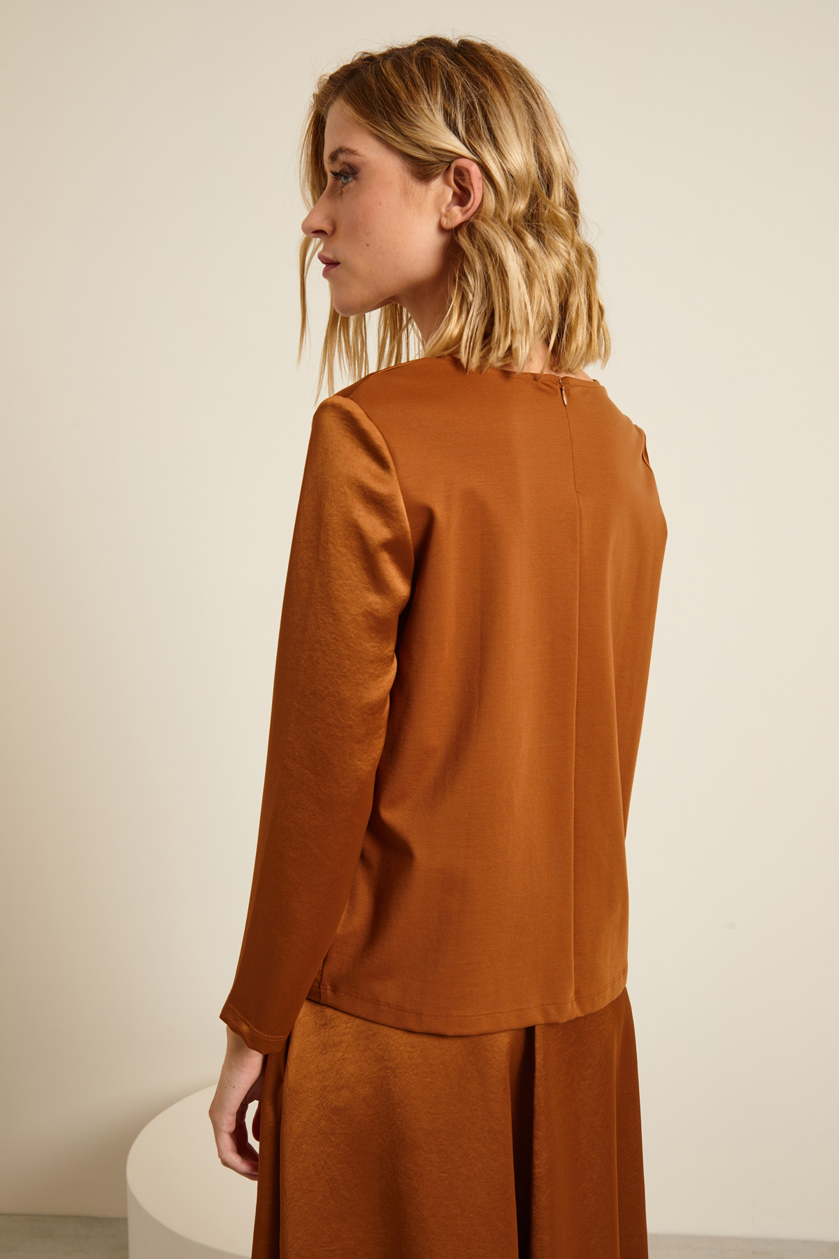 T-shirt dalla linea dritta realizzata in raso con inserto in jersey nel retro, scollo a giro, maniche lunghe e allacciatura tramite zip invisibile dietro.