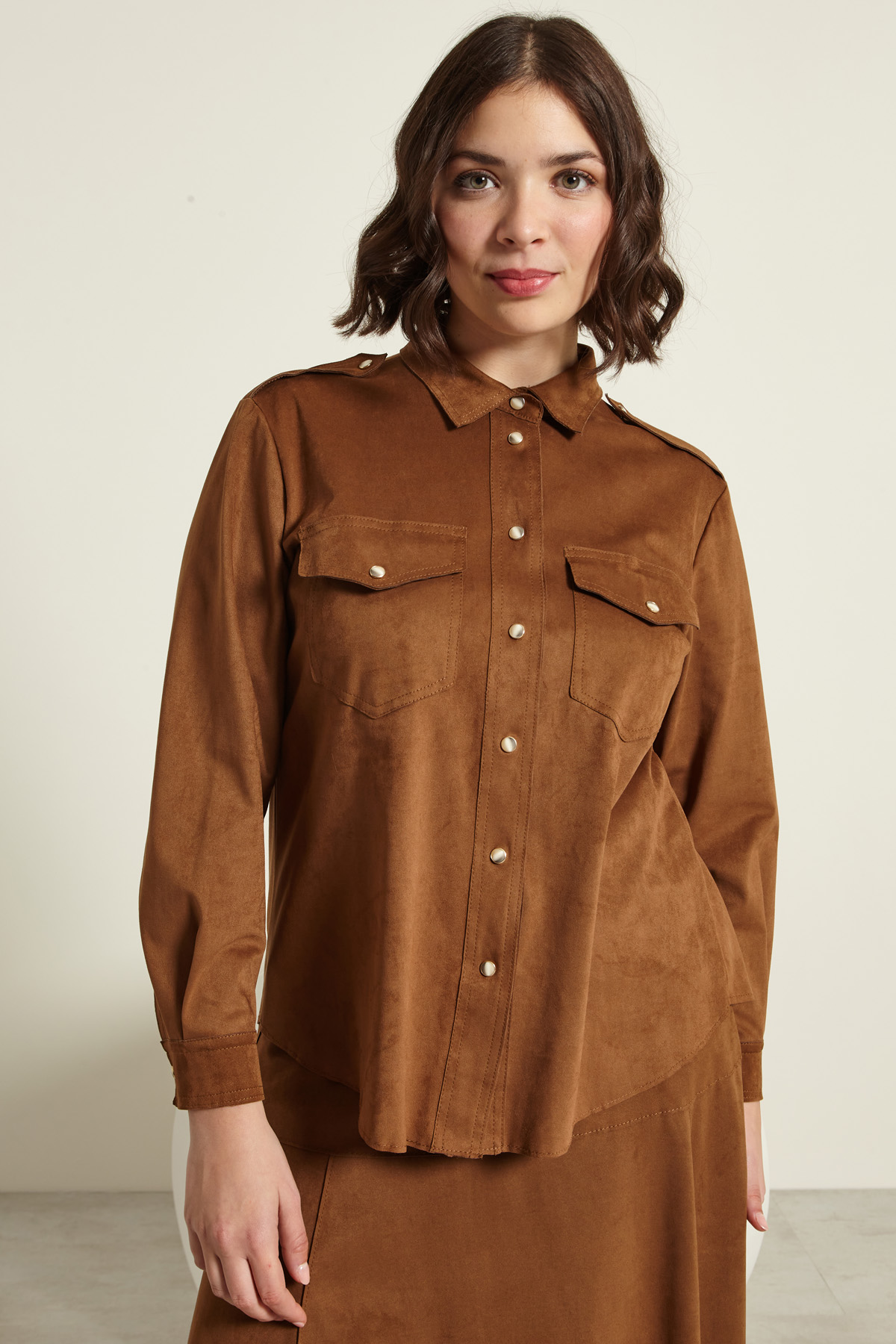 Camicia dalla linea dritta realizzata in jersey stretch effetto suede, con colletto classico, maniche lunghe con polsino e bottone, taschini applicati al petto con patta, alamari sulle spalle, carrè e cannoncino nel retro. Allacciatura tramite bottoni automatici.