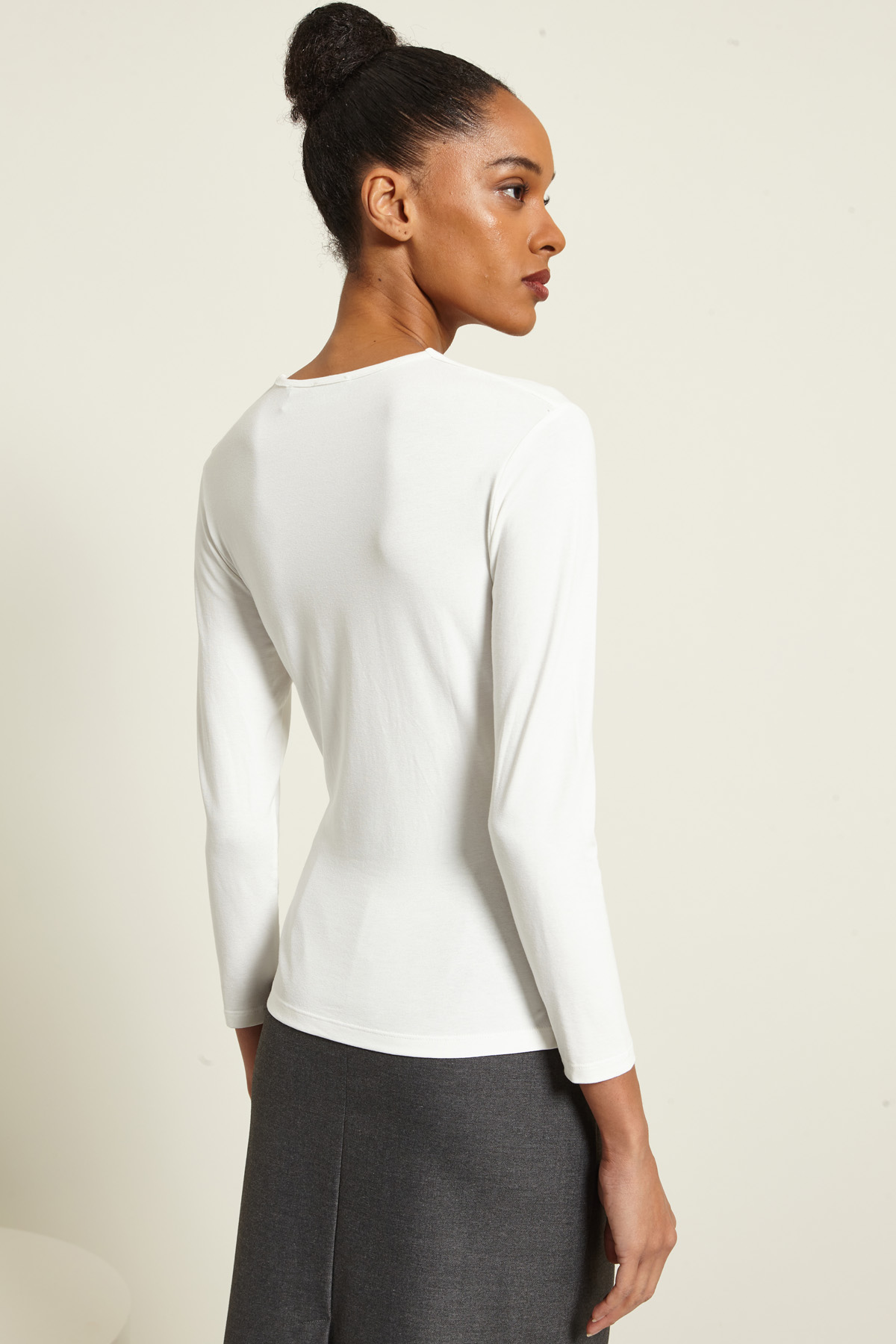 T-shirt dalla linea aderente realizzata in jersey di viscosa stretch con motivo incrociato sul davanti, scollo a V e maniche tre quarti.