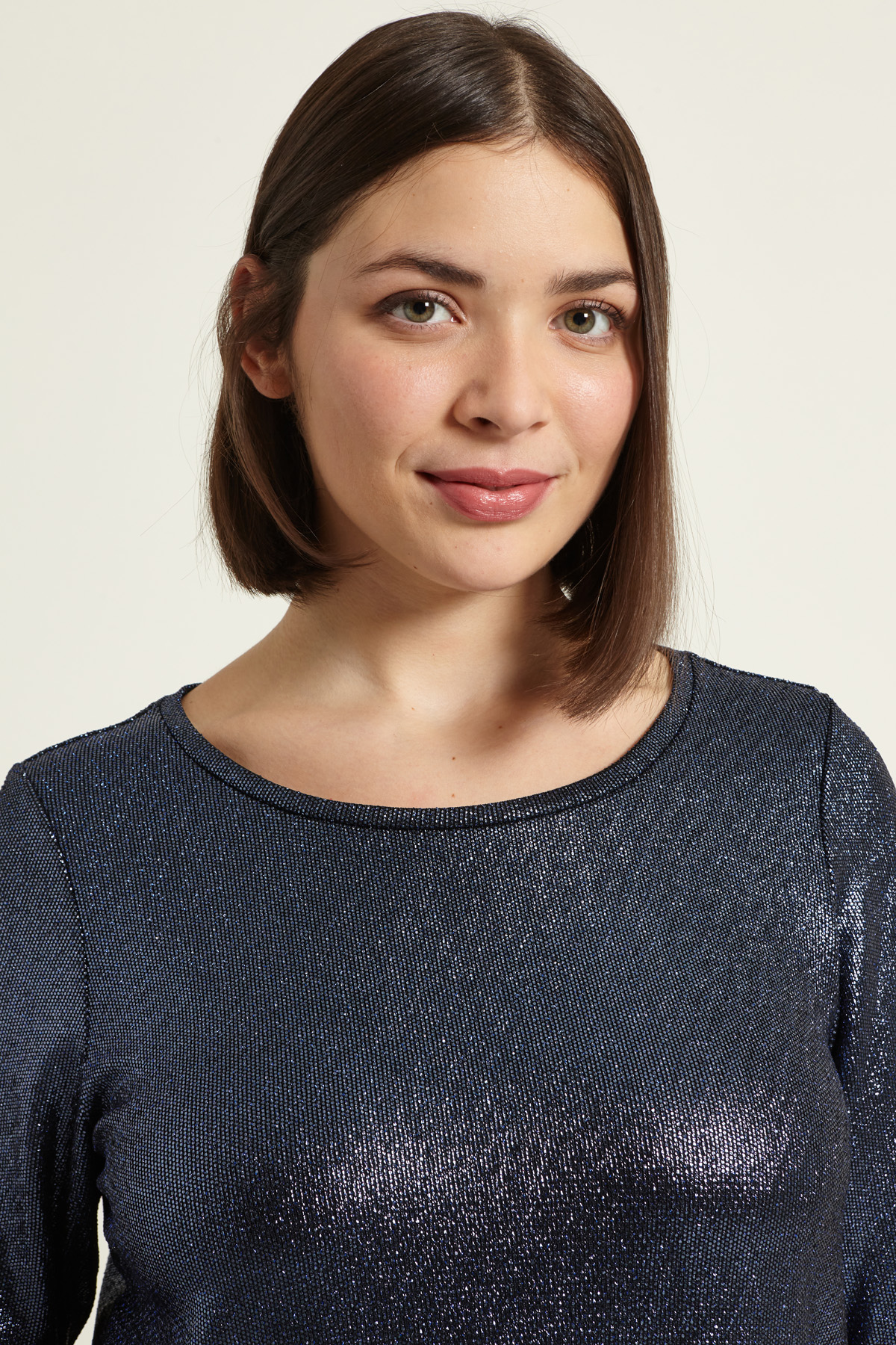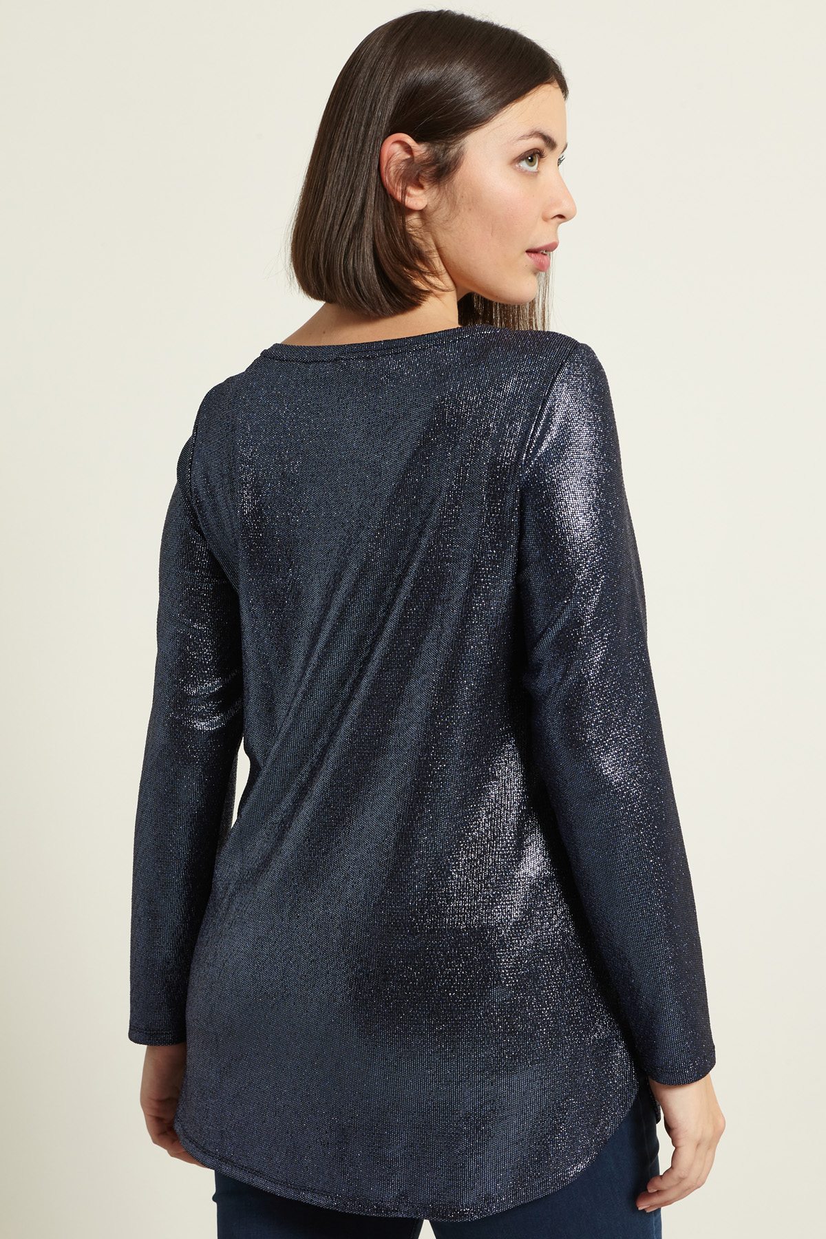 T-shirt dalla linea dritta realizzata in jersey stretch stampato dal finish laminato, con scollo rotondo e maniche lunghe.