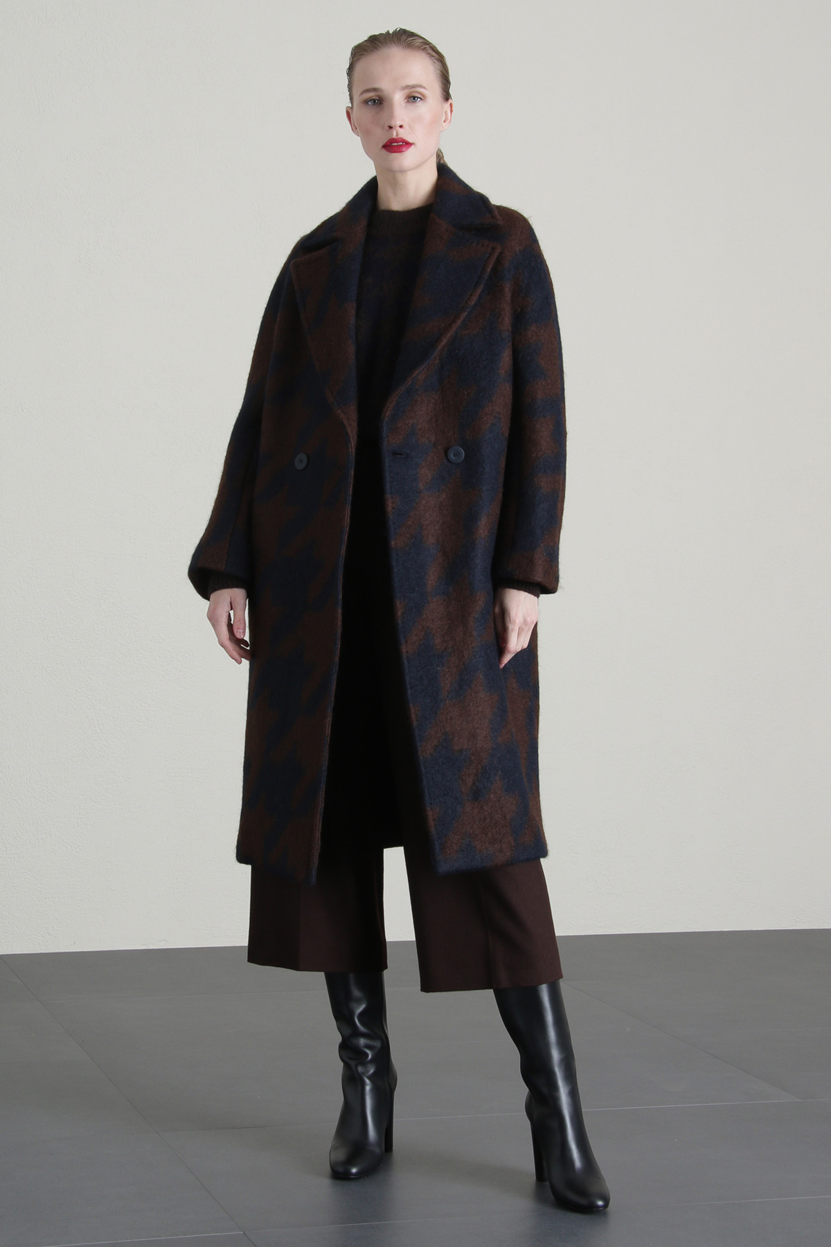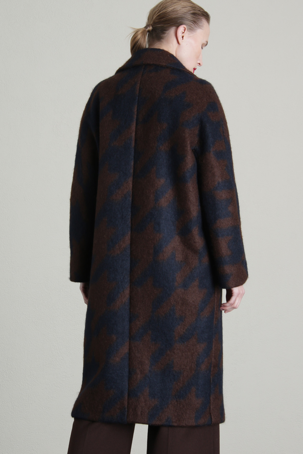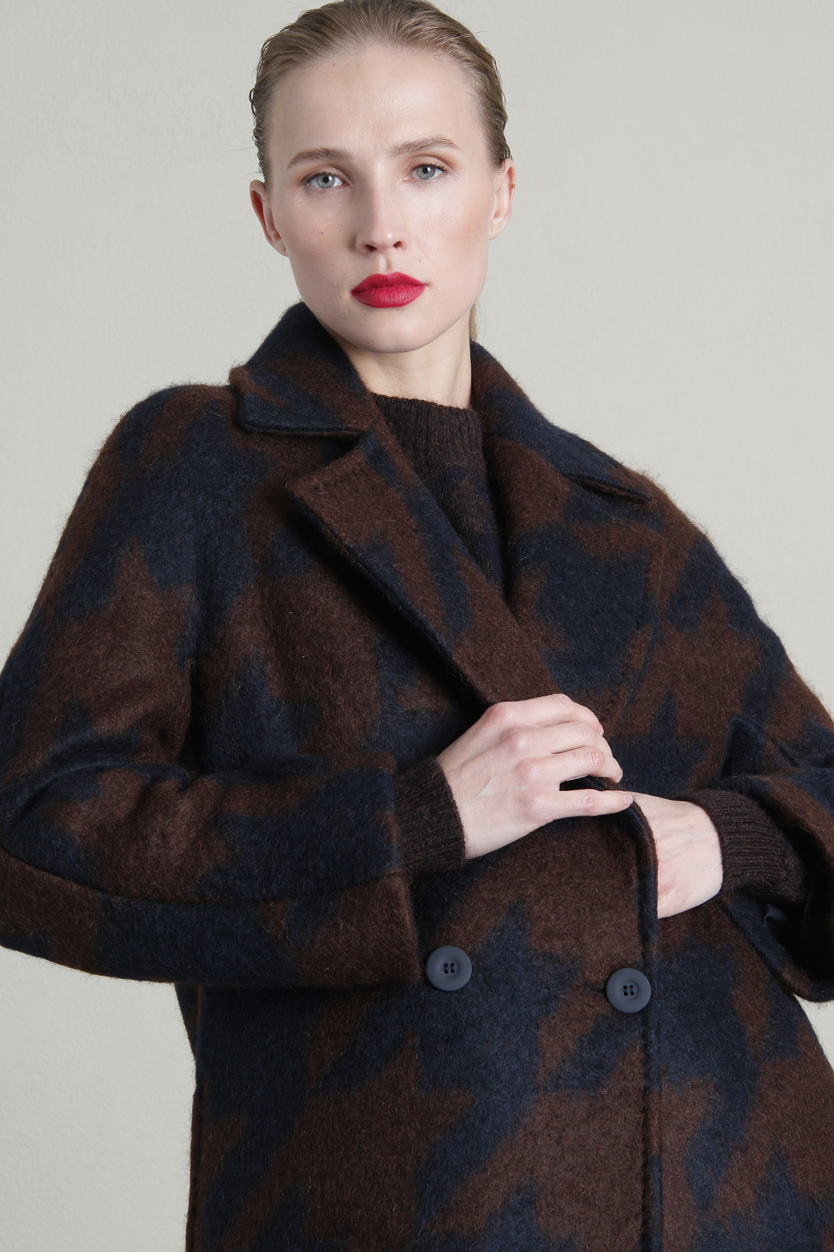 Cappotto dalla linea dritta realizzato in tessuto garzato di misto mohair e lana jacquard, con collo a rever, maniche lunghe a kimono e tasche laterali inserite in cucitura. Allacciatura doppiopetto tramite bottoni. Semifoderato.