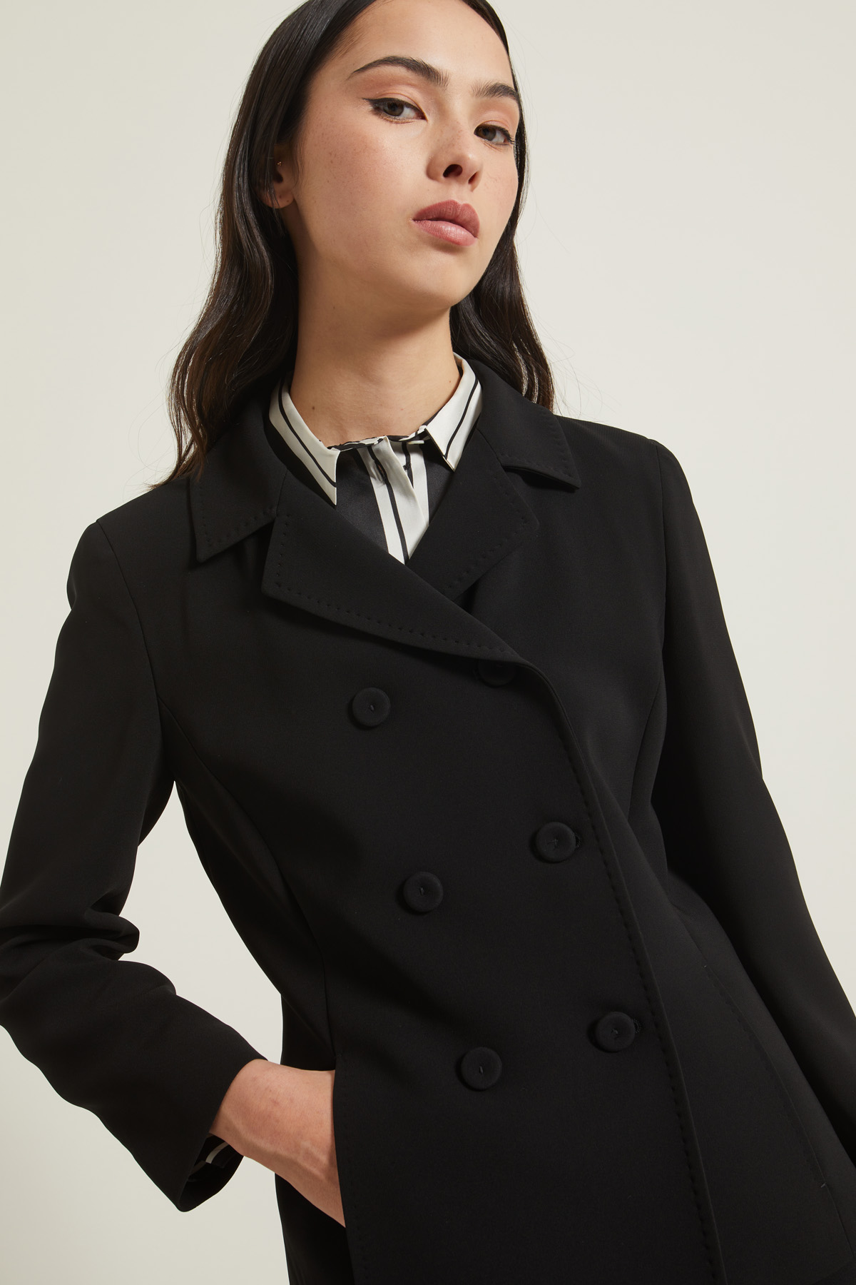 Blazer dalla linea dritta realizzato in cady, con collo rever, maniche lunghe e tasche inserite in cucitura, profili rifiniti a puntino. Allacciatura doppiopetto tramite bottoni rivestiti. Foderato.
