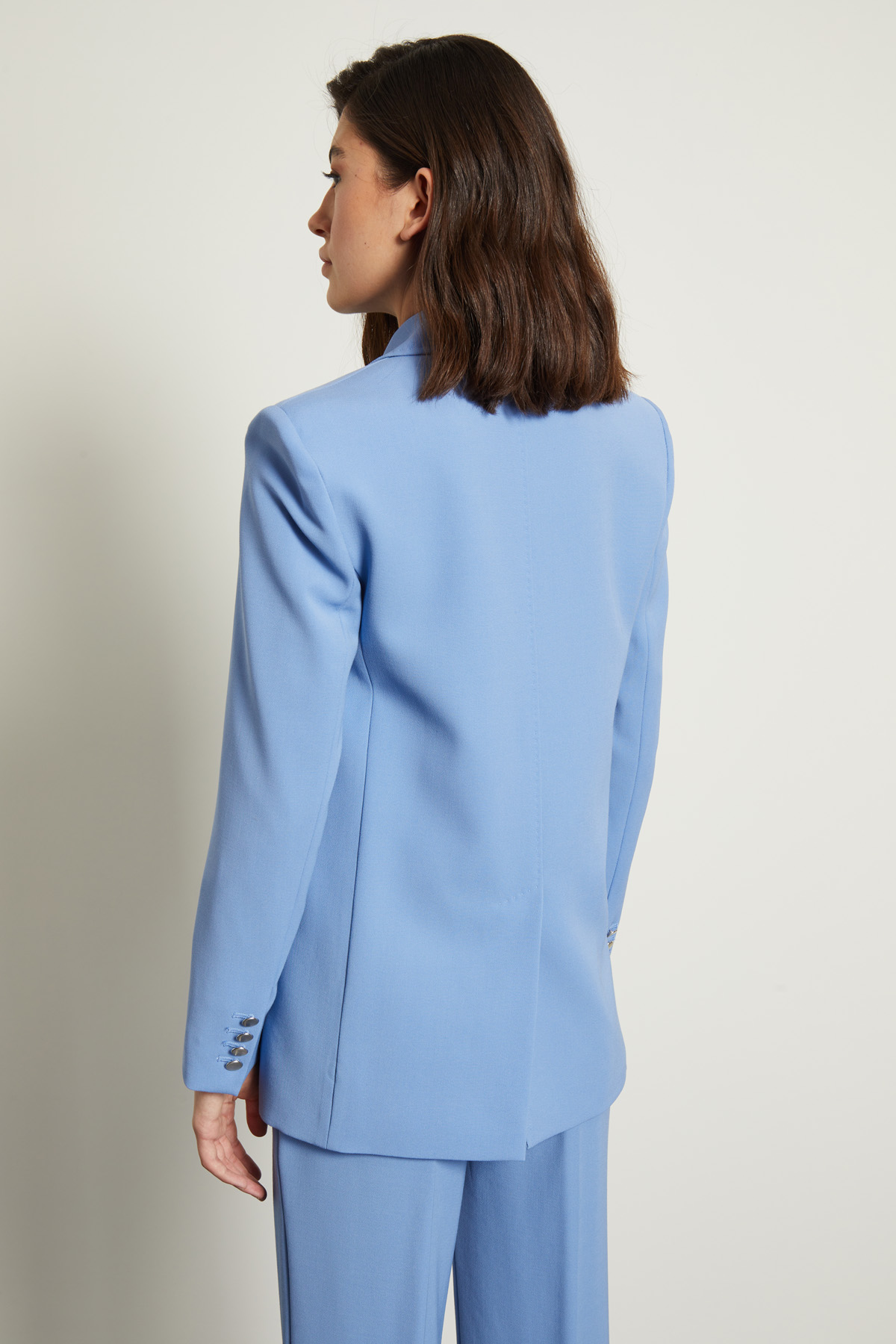 Blazer dalla linea dritta realizzato in tricotina di pura lana, con collo a rever, maniche lunghe con bottoni, spalle imbottite, taschino a filettone e tasche a doppio filetto con patta. Spacco nel retro e profili rifiniti a puntino. Allacciatura doppiopetto tramite bottoni in metallo. Foderato.