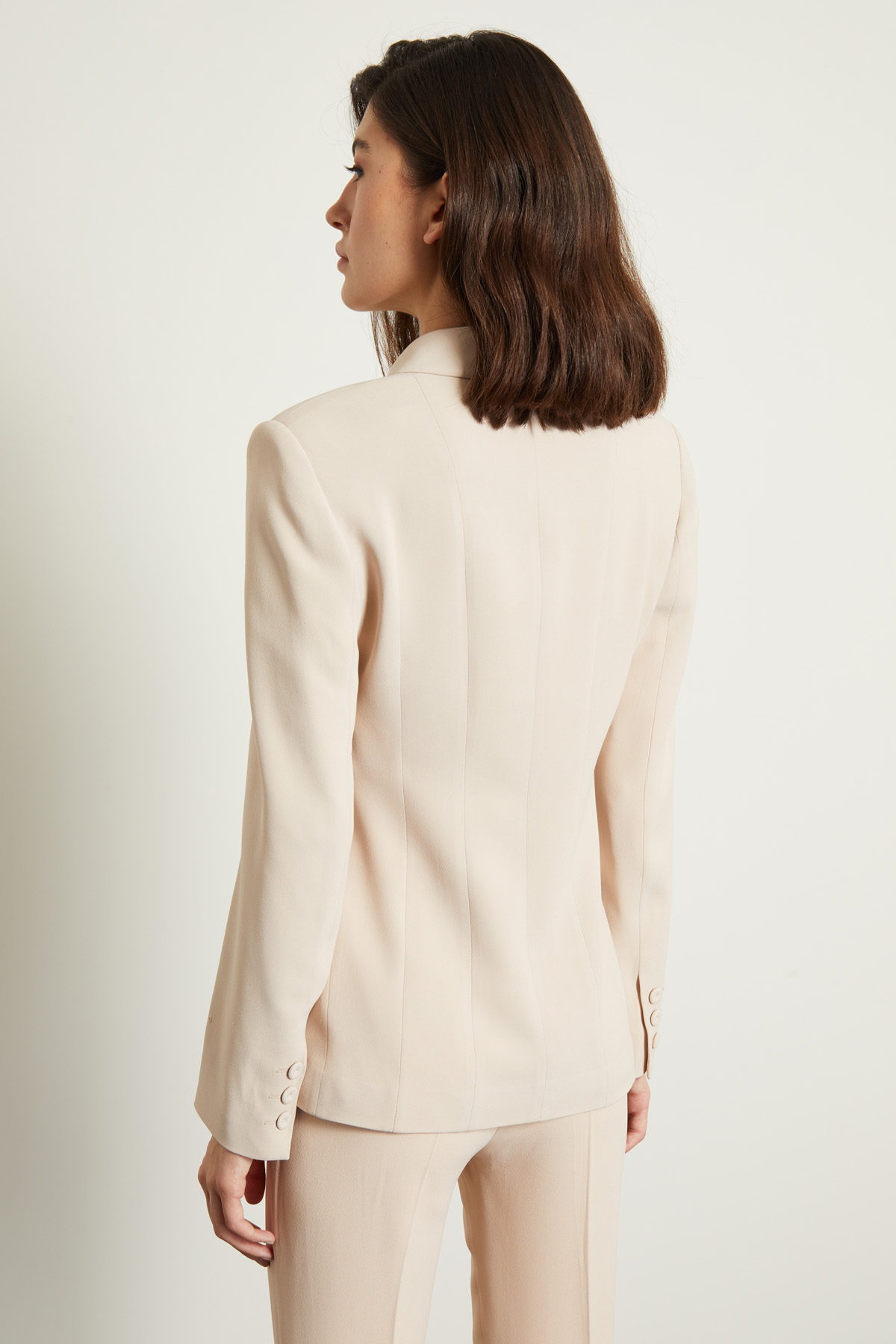 Blazer dalla linea sfiancata realizzato in cady, con collo a rever, maniche lunghe con bottoni al fondo, pinces e allacciatura doppiopetto tramite bottoni rivestiti. Foderato.