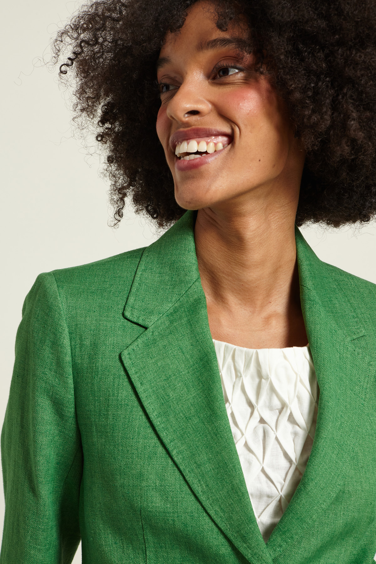 Blazer dalla linea dritta realizzato in batavia di puro lino, con collo a rever, maniche lunghe con bottoni, tasche a doppio filetto con patta e spacco nel retro, profili rifiniti a puntino. Allacciatura monopetto tramite bottoni. Foderato.