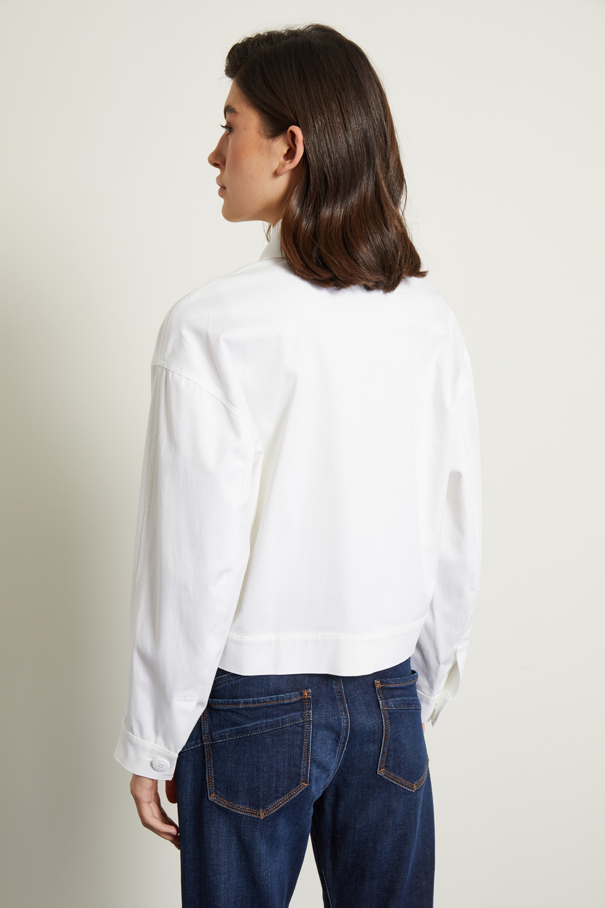 Giacca corta dalla linea boxy realizzata in gabardina di cotone stretch, con collo a camicia, maniche lunghe con polsino e bottone, tasche applicate con patta sul davanti. Allacciatura monopetto nascosta tramite bottoni. Sfoderata.