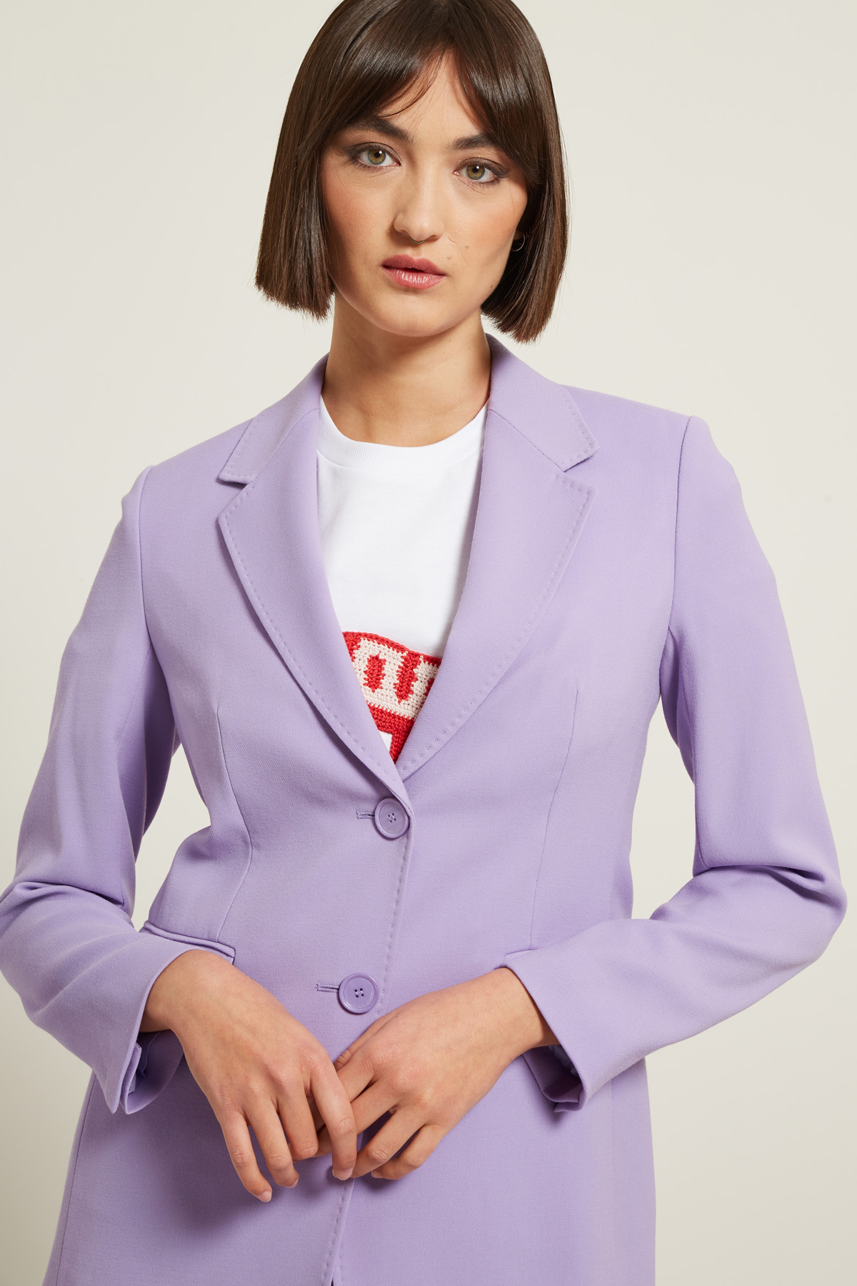 Blazer dalla linea dritta realizzato in tricotina di pura lana, con collo a rever, maniche lunghe con spacchetto al fondo, tasche a doppio filetto con patta, spacco nel retro e profili rifiniti a puntino. Allacciatura monopetto tramite bottoni. Foderato.