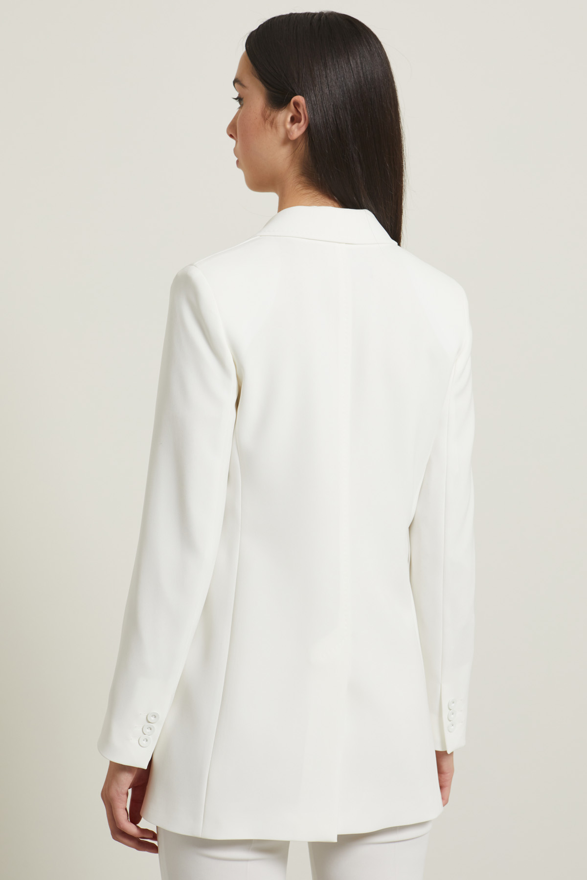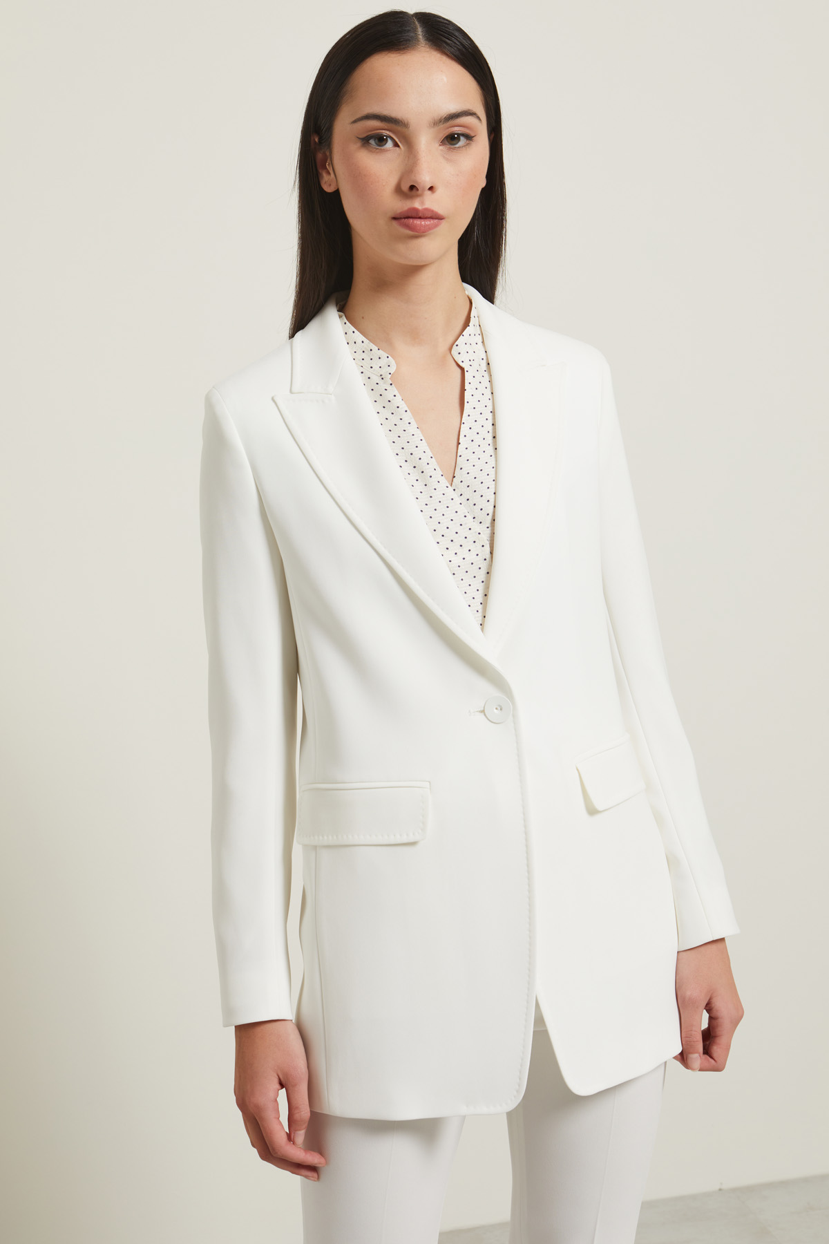 Blazer dalla linea dritta realizzato in cady, con collo a rever, maniche lunghe con bottoni al fondo, tasche a doppio filetto con patta, spacco nel retro e profili rifiniti a puntino. Allacciatura monopetto tramite bottone. Foderato.