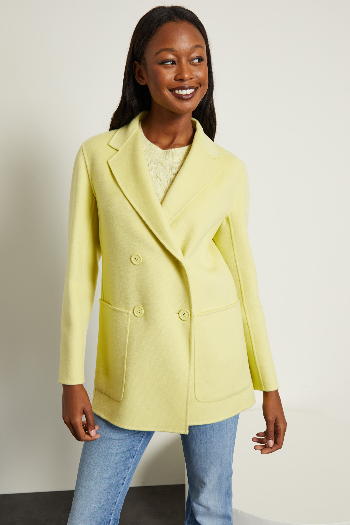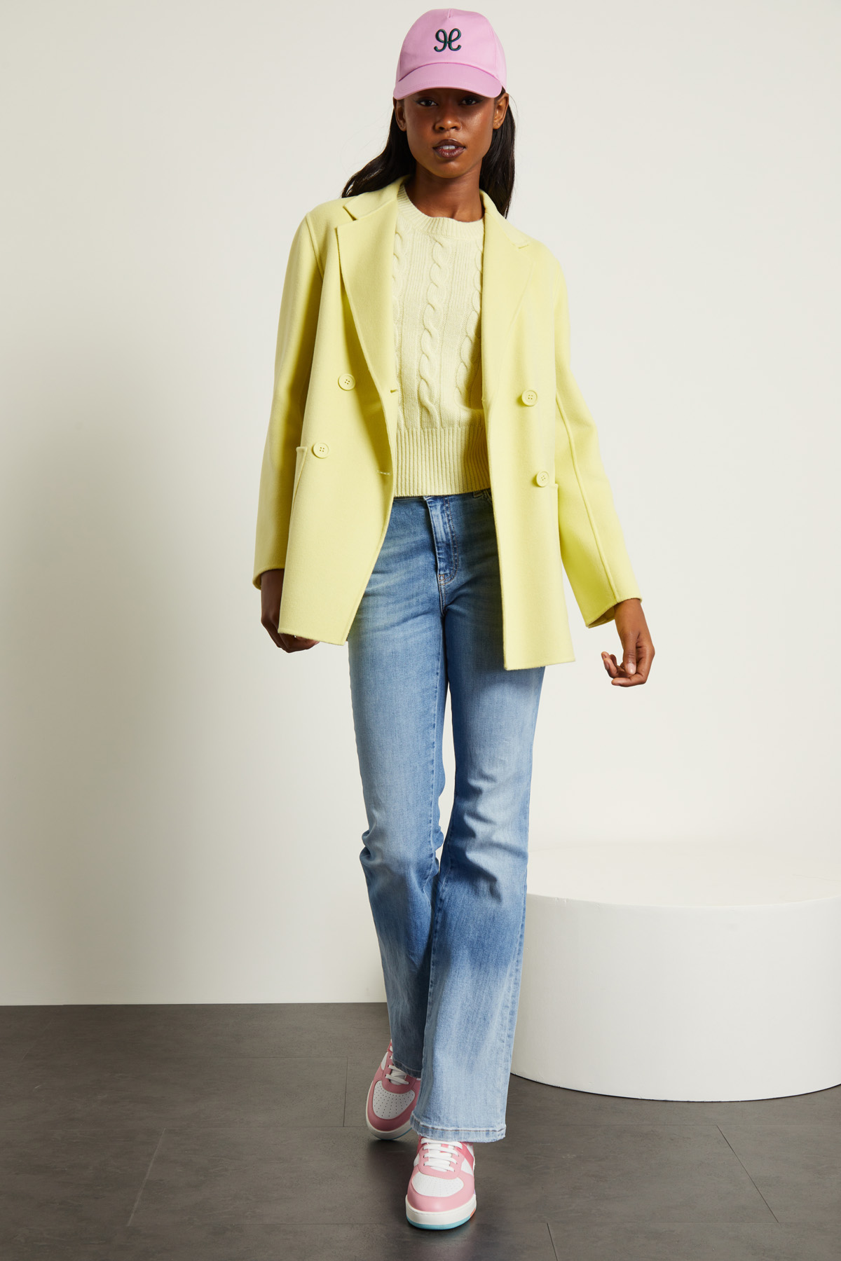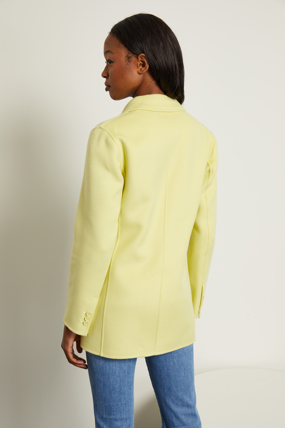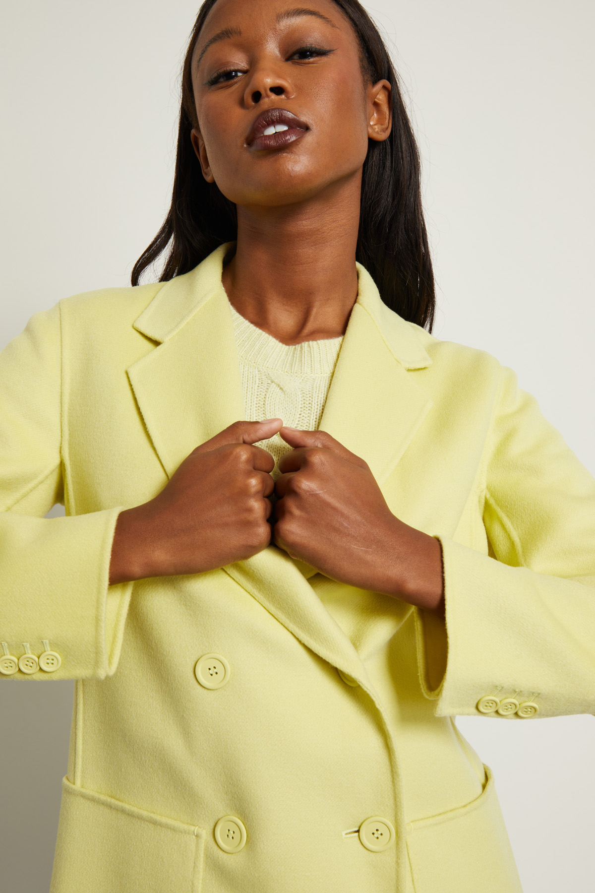 Giaccone dalla linea dritta realizzato in doppio panno di lana, cshmere e seta, con collo a rever, maniche lunghe con bottoni, tasche applicate e spacco nel retro. Allacciatura doppiopetto tramite bottoni. Sfoderato.