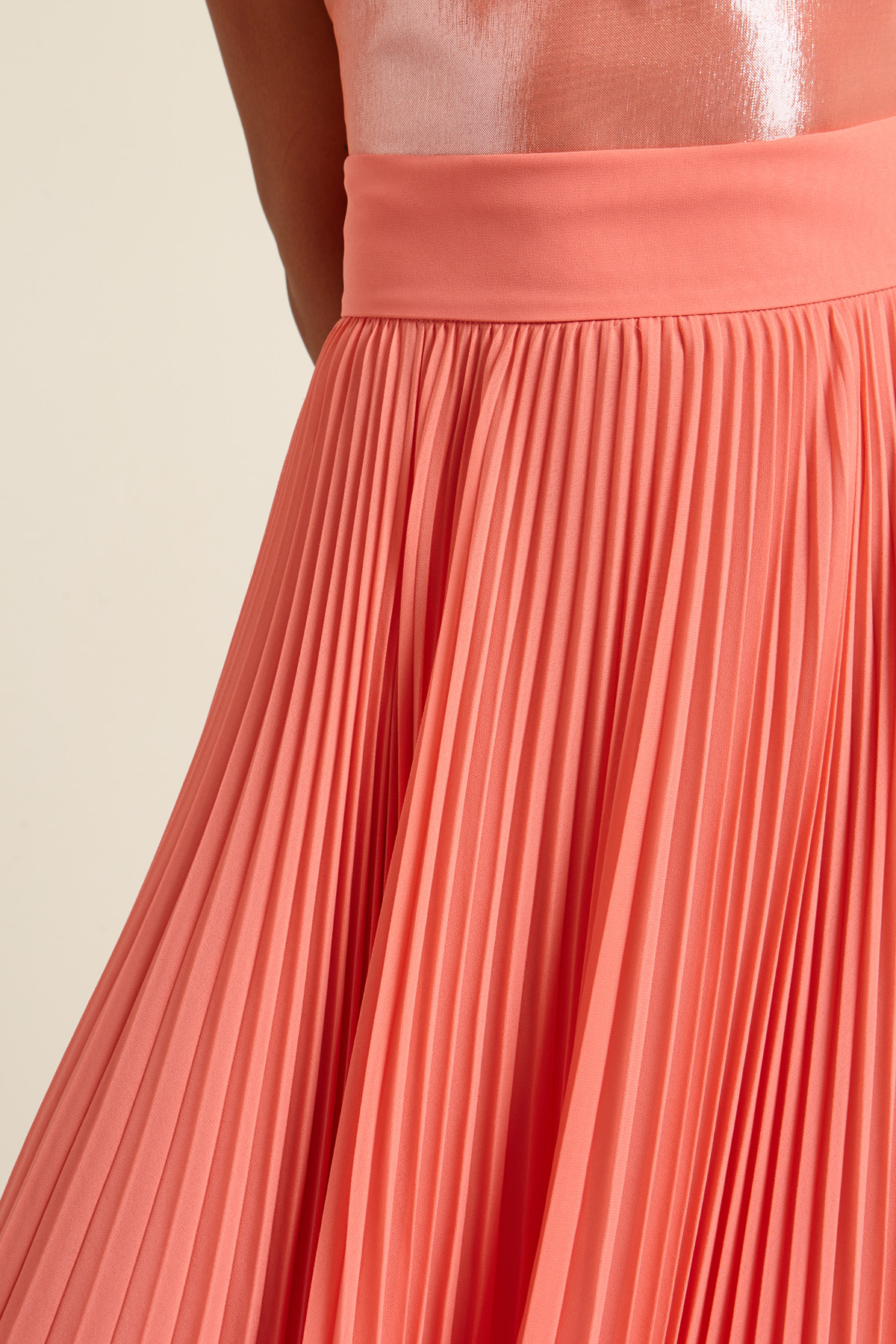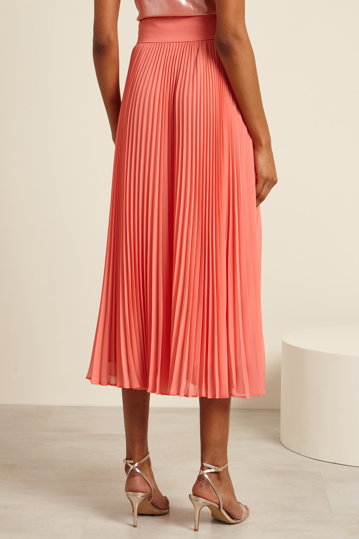 Gonna dalla linea svasata realizzata in georgette con lavorazione plissé, con cintone in vita e allacciatura tramite zip sul fianco. Foderata.