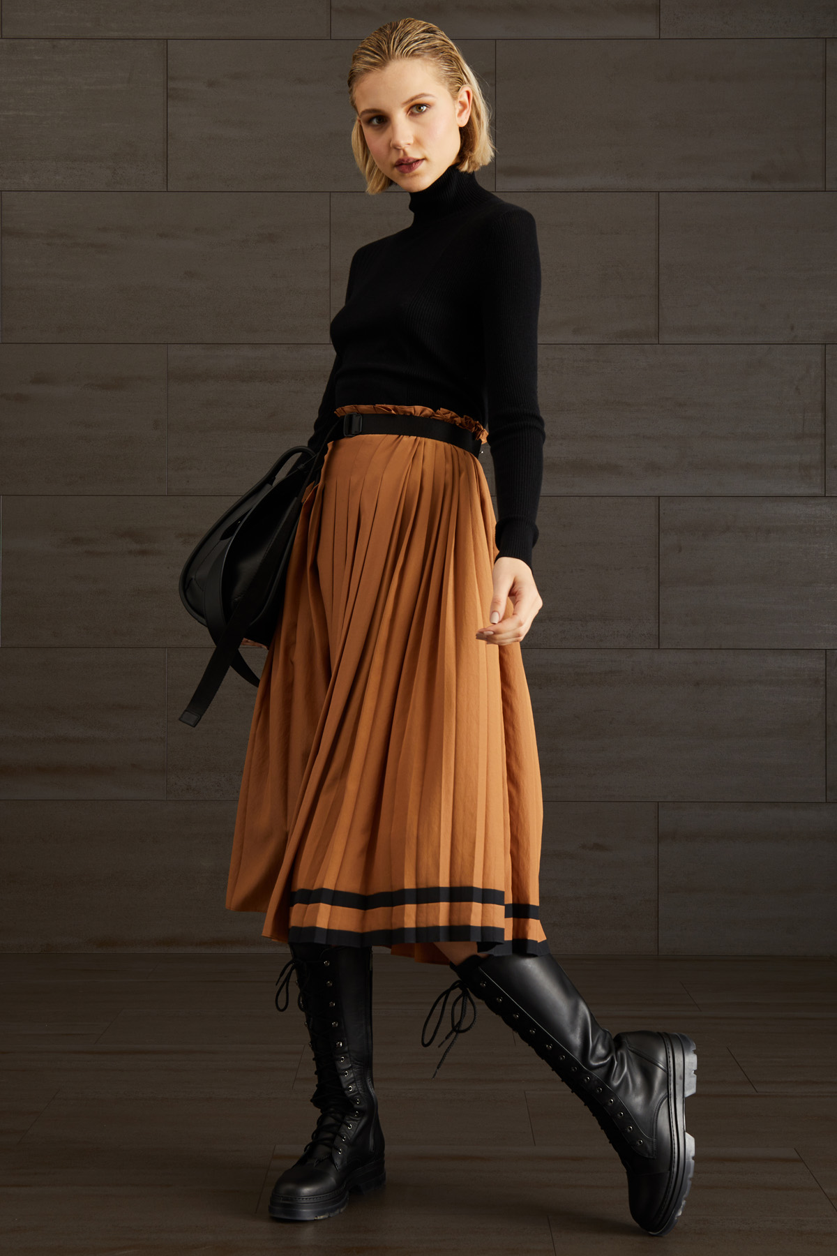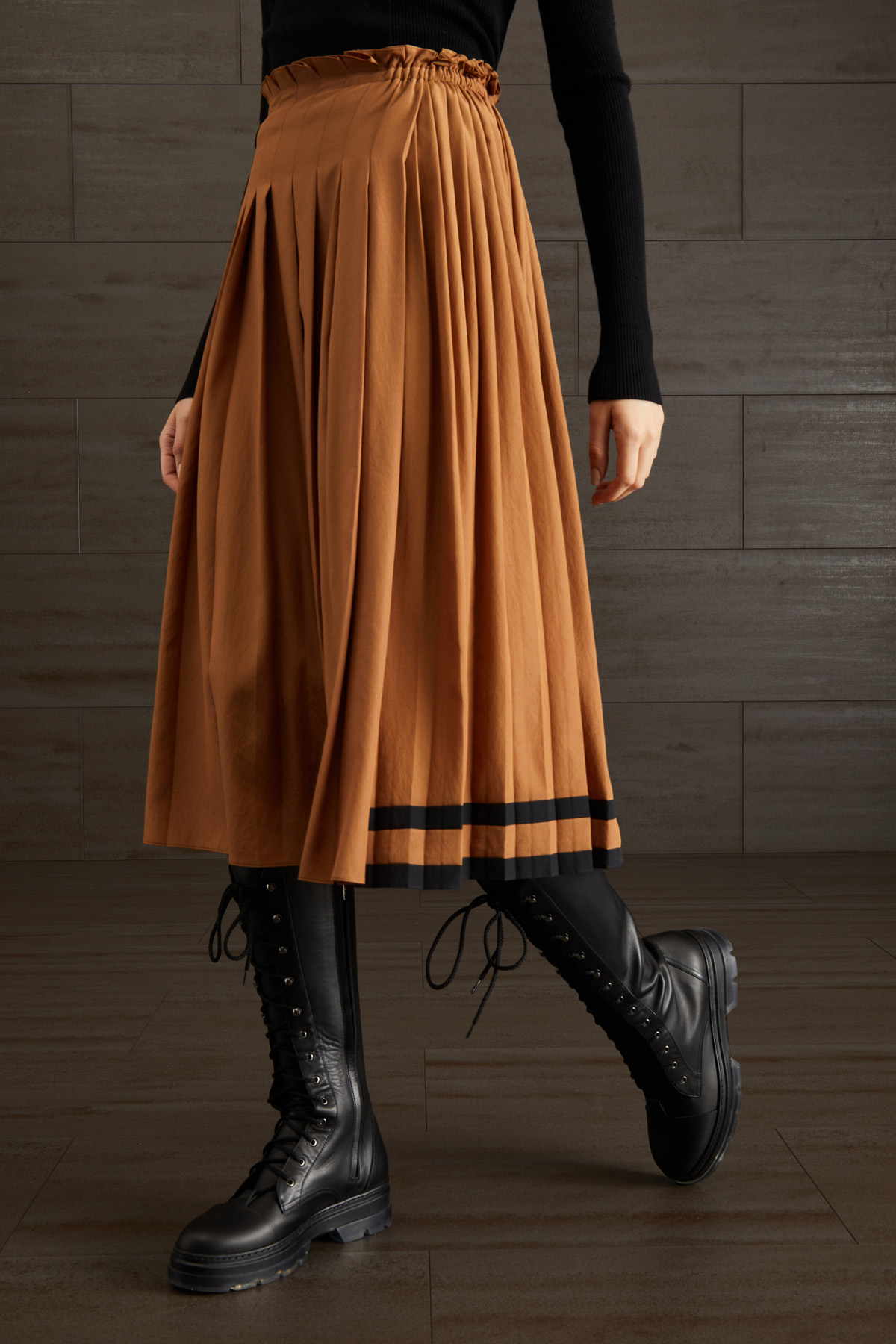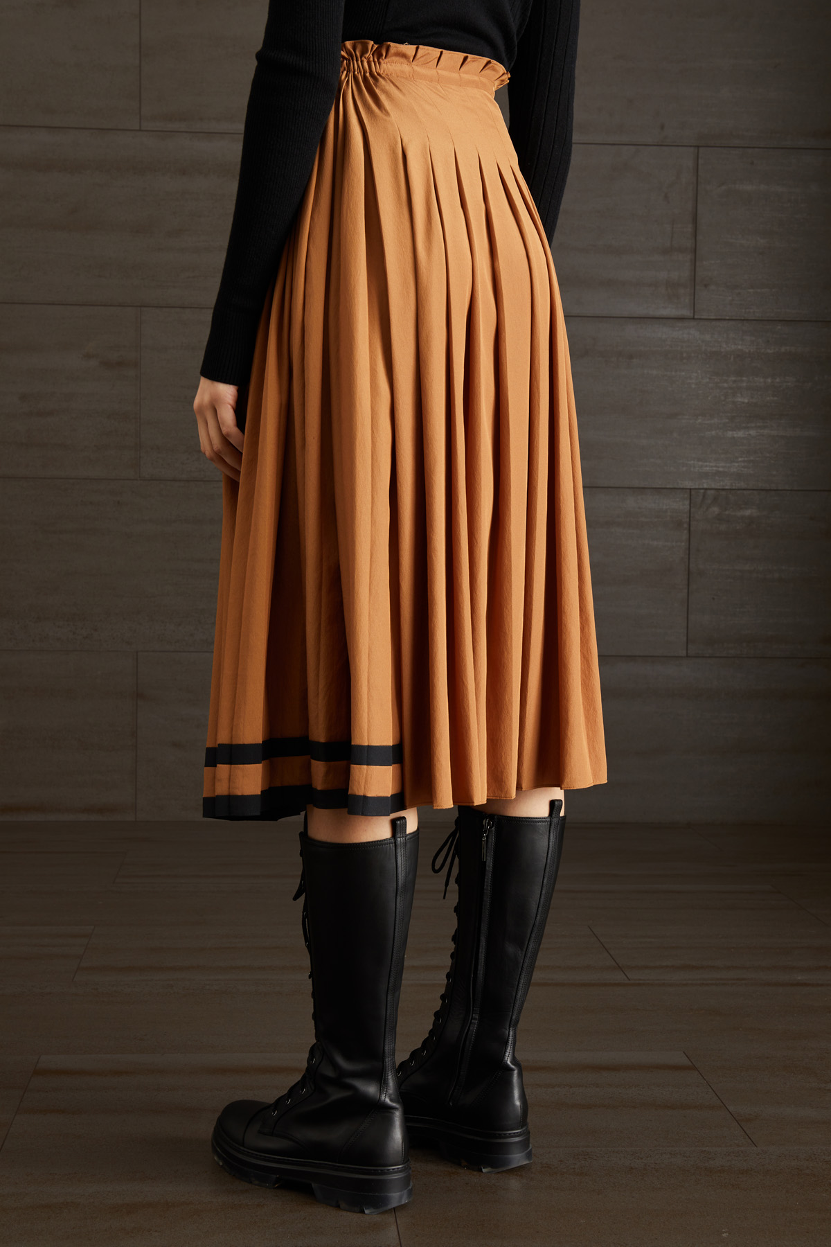 Gonna a pieghe dalla linea svasata realizzata in crêpe de chine con dettaglio a contrasto, spacco sul davanti e retro. Allacciatura tramite zip. Capo dotato di cintura coordinata.