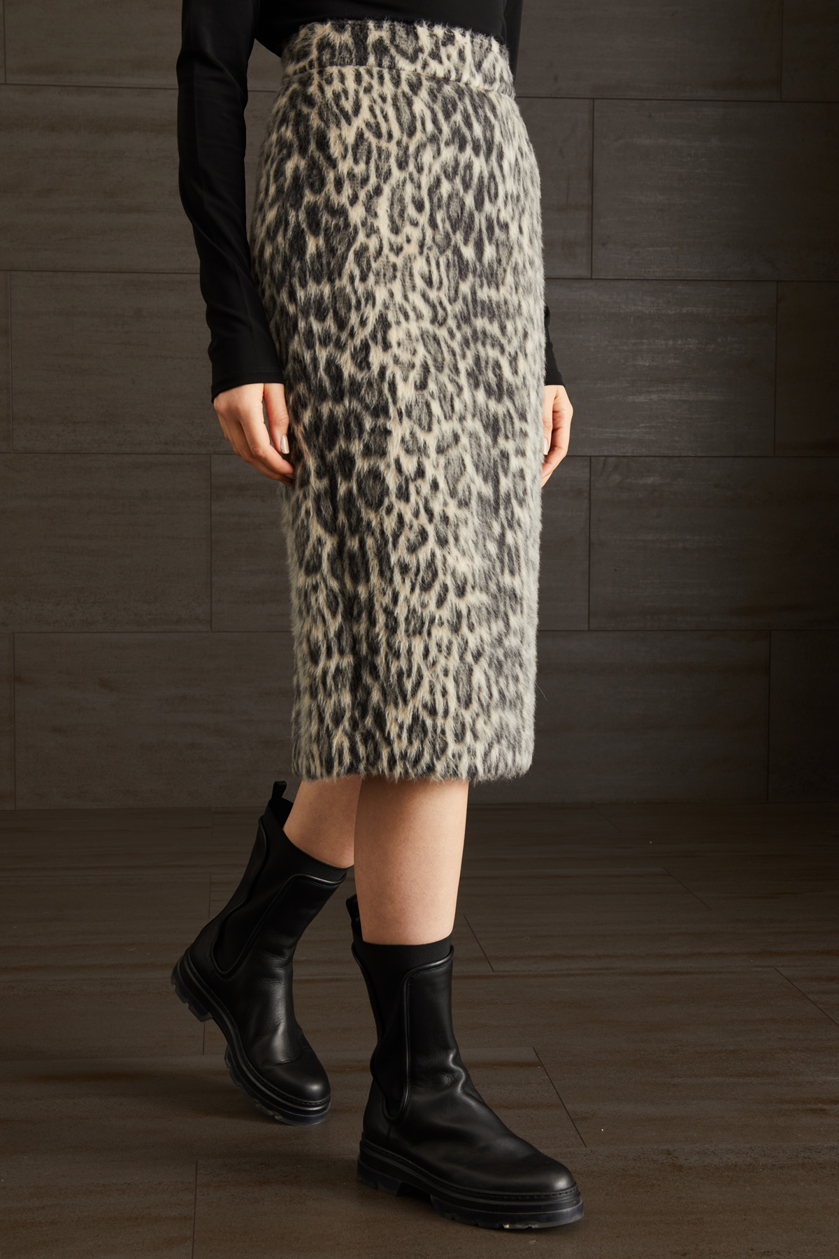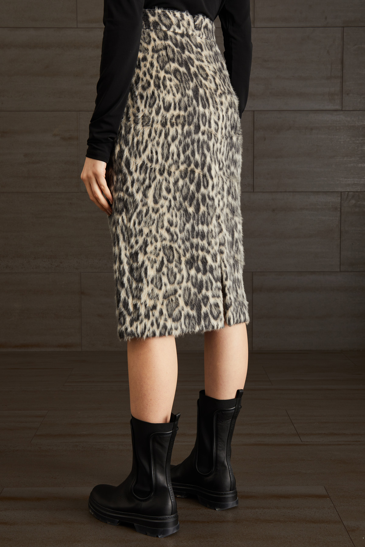 Gonna a tubino realizzata in tessuto garzato di lana e alpaca, con cintone in vita e spacco nel retro. Allacciatura tramite zip invisibile nel retro. Foderato.