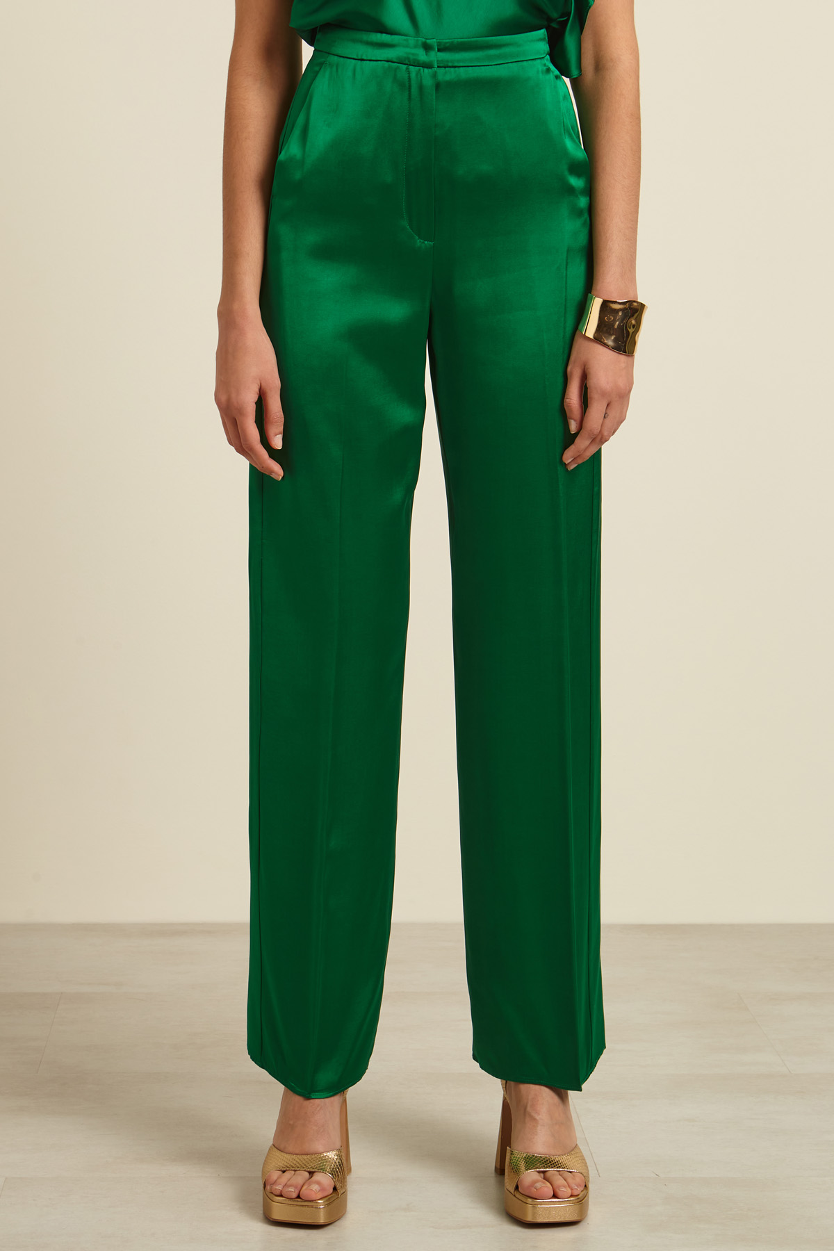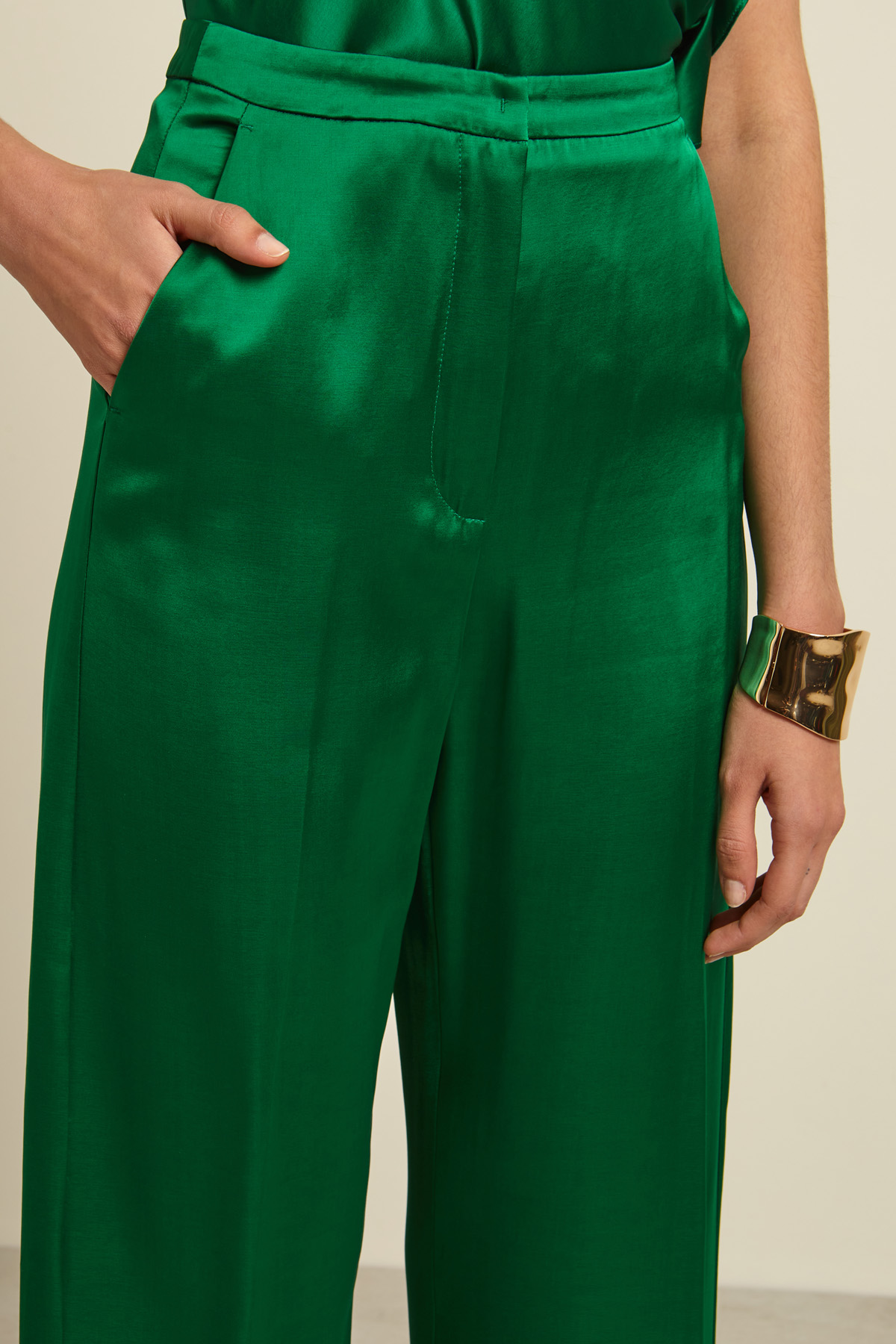 Pantaloni dalla linea fluida realizzati in satin di viscosa con tasche alla francese. Allacciatura nascosta tramite zip, gancio e bottone.