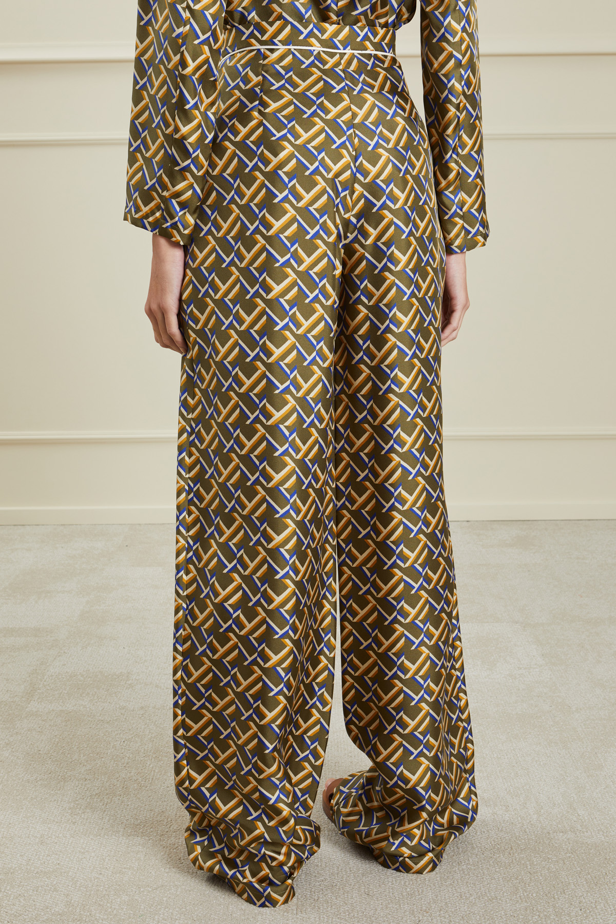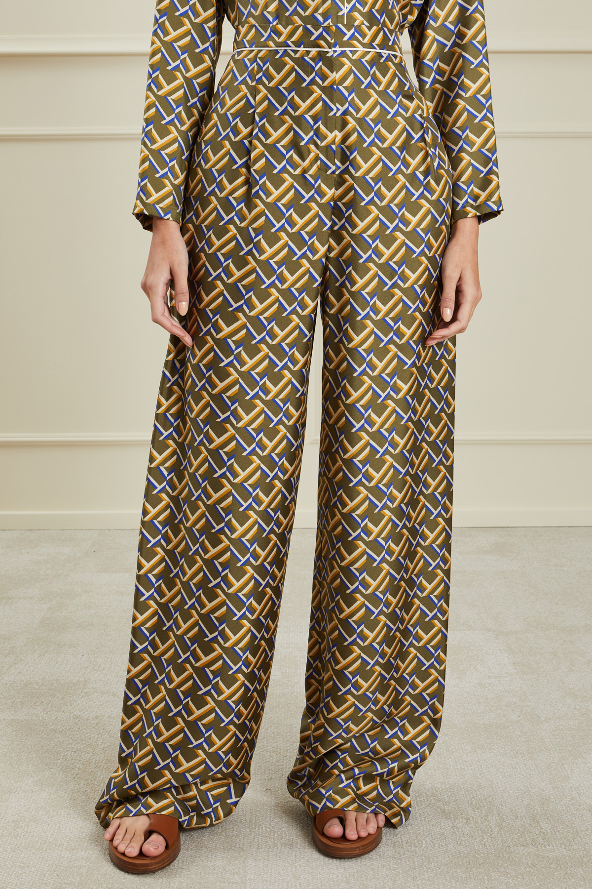 Pantaloni a palazzo dalla linea fluida realizzati in twill di pura seta stampata, con tasche laterali inserite in cucitura, motivo di pieghe cucite in vita e dettaglio di piping. Allacciatura nascosta tramite zip, bottone e gancio.