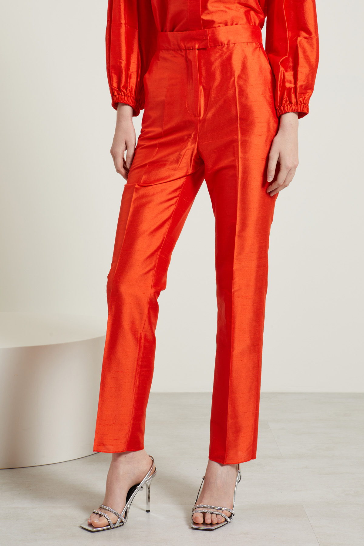 Pantaloni carrot realizzati in shantung di pura seta, con cintone in vita, tasche alla francese e piega stirata davanti e dietro. Allacciatura nascosta tramite zip, bottone e gancio.