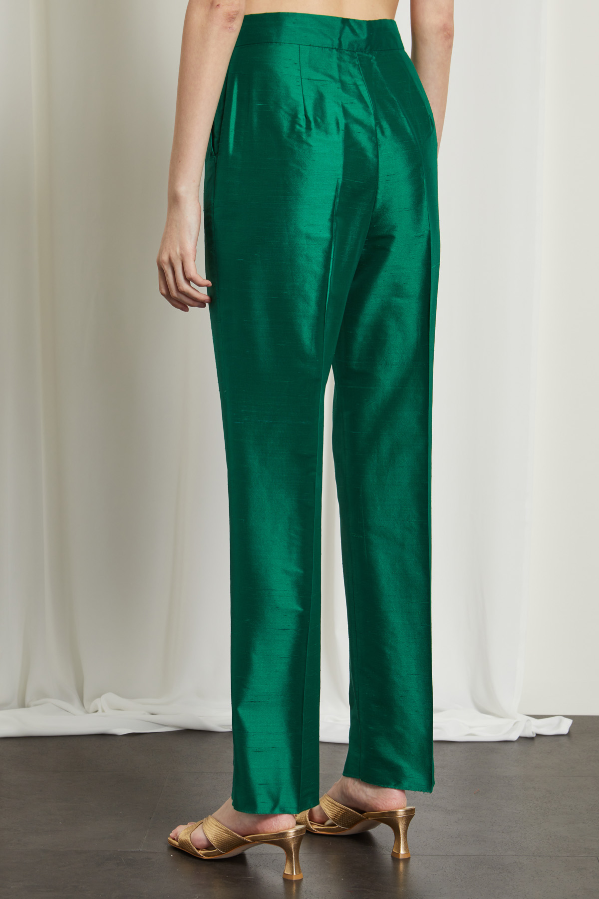 Pantaloni carrot realizzati in shantung di pura seta, con cintone in vita, tasche alla francese e piega stirata davanti e dietro. Allacciatura nascosta tramite zip, bottone e gancio.