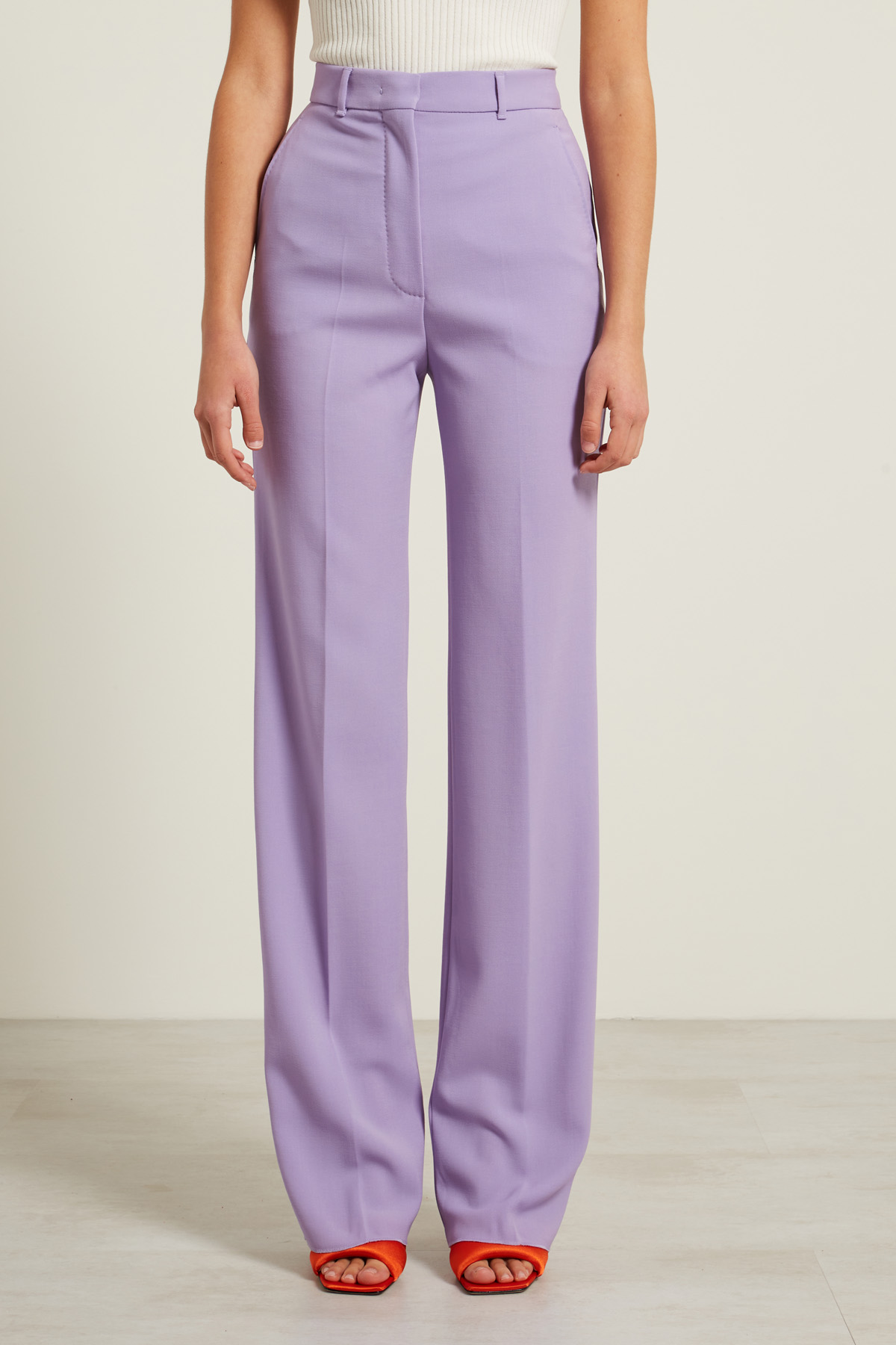 Pantaloni a palazzo realizzati in tricotina di pura lana con passanti in vita, piega stirata e tasche alla francese rifinite a puntino. Allacciatura nascosta tramite zip, bottone e gancio.