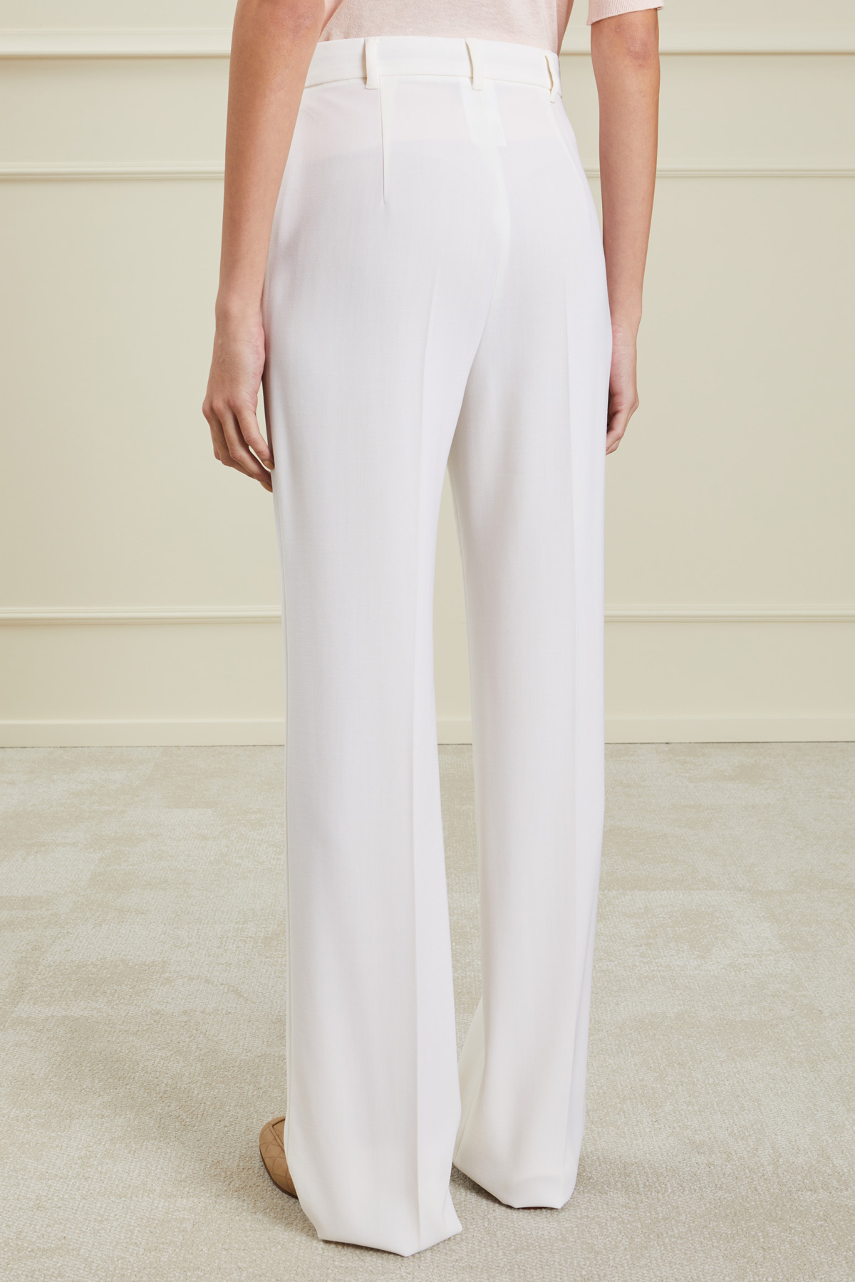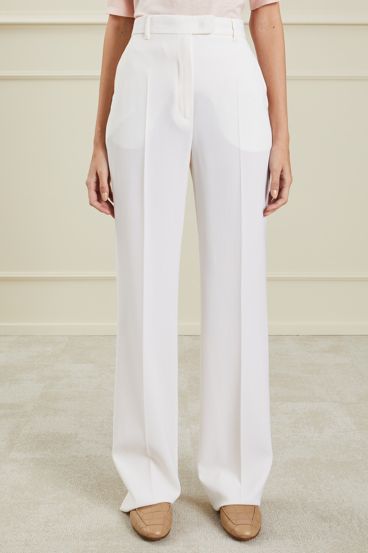 Pantaloni a palazzo realizzati in saia di pura lana, con passanti in vita, tasche alla francese sul davanti, profili rifiniti a puntino e allacciatura nascosta tramite zip, bottone e gancio.