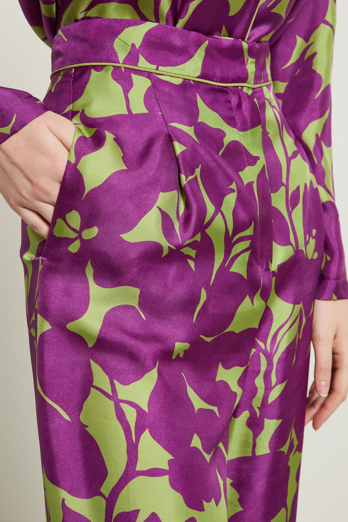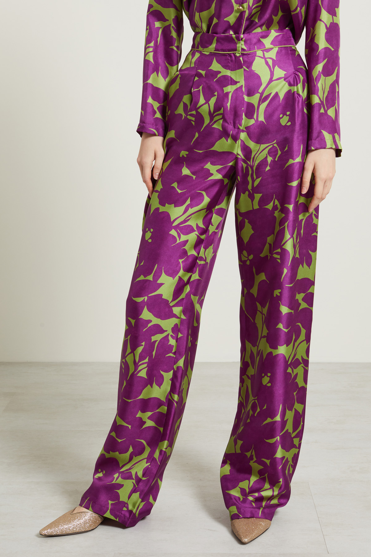 Pantaloni a palazzo a vita alta realizzati in twill di pura seta stampata, con cintone e pieghe cucite in vita, tasche laterali inserite in cucitura e dettaglio di piping. Allacciatura nascosta tramite zip, bottone e gancio.
