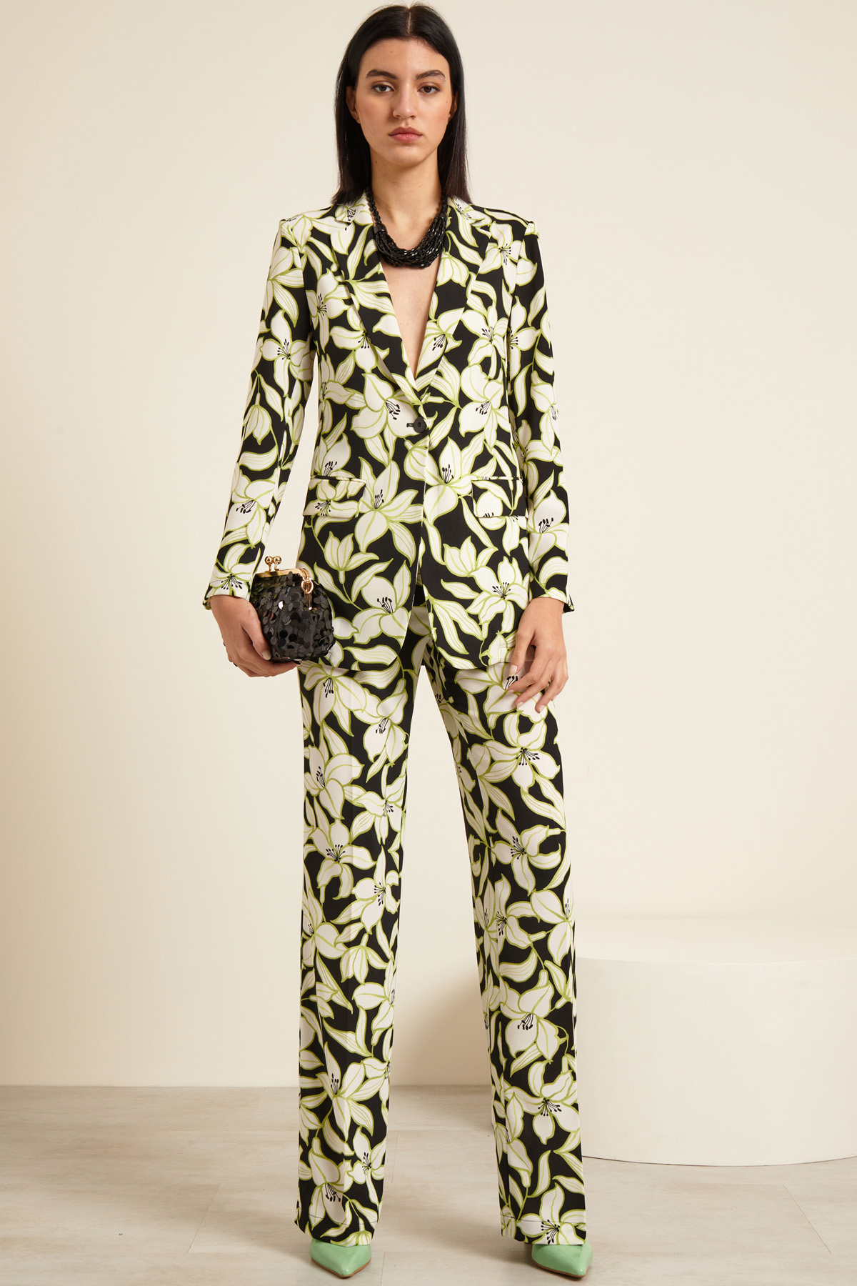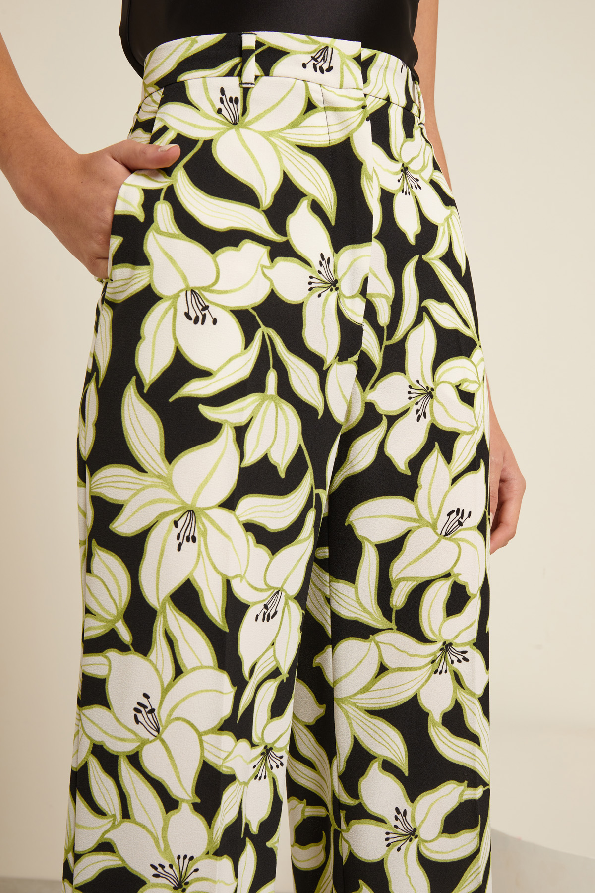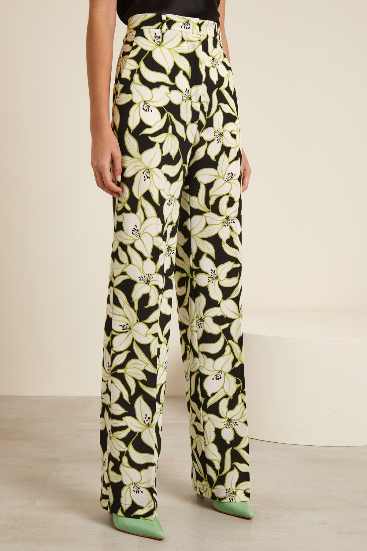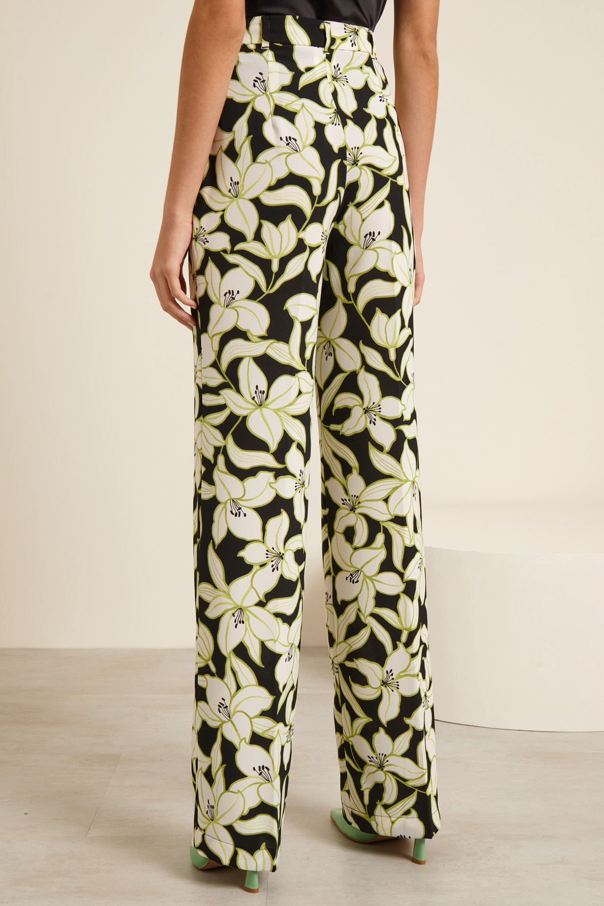 Pantaloni in tessuto sablé stretch dalla linea dritta e fluida. Stampa floreale gigli. Piega stirata.