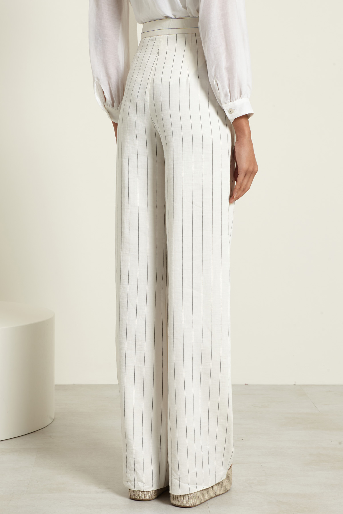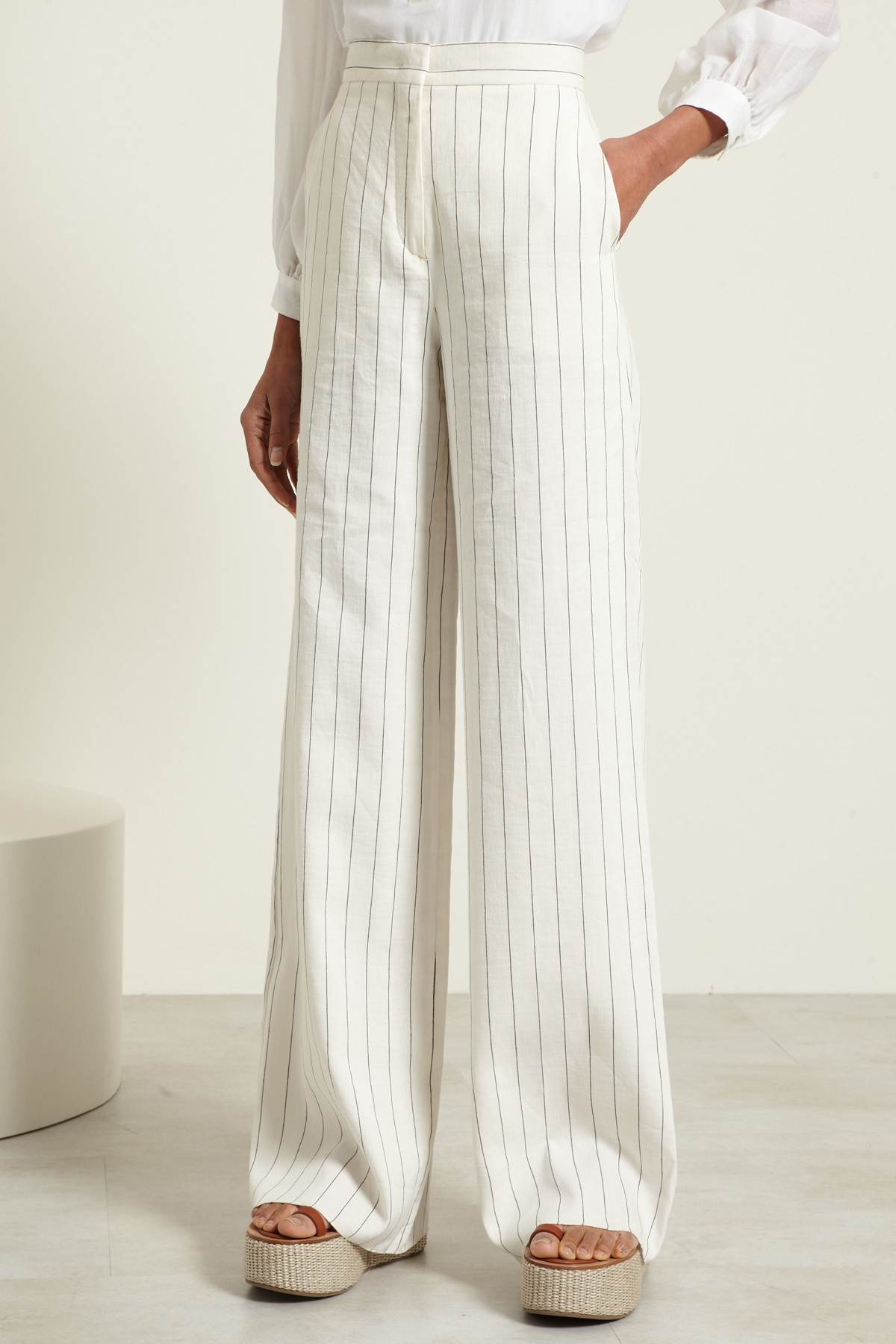 Pantaloni a palazzo realizzati in tela di lino e cotone gessata, con cintone in vita e tasche alla francese davanti.Allacciatura nascosta tramite zip, bottone e gancio.