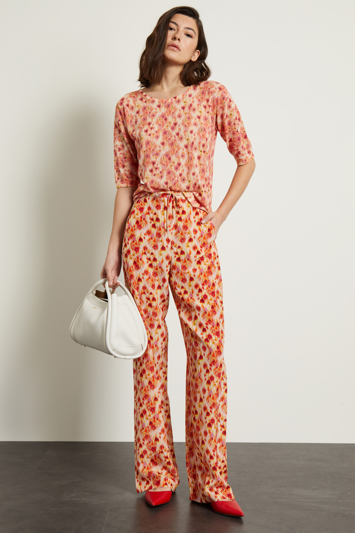 Pantaloni dalla linea fluida realizzati in crépe de chine di pura seta stampata, con inserto elastico in vita e coulisse, tasche laterali alla francese. Allacciatura nascosta tramite zip, bottone e gancio.