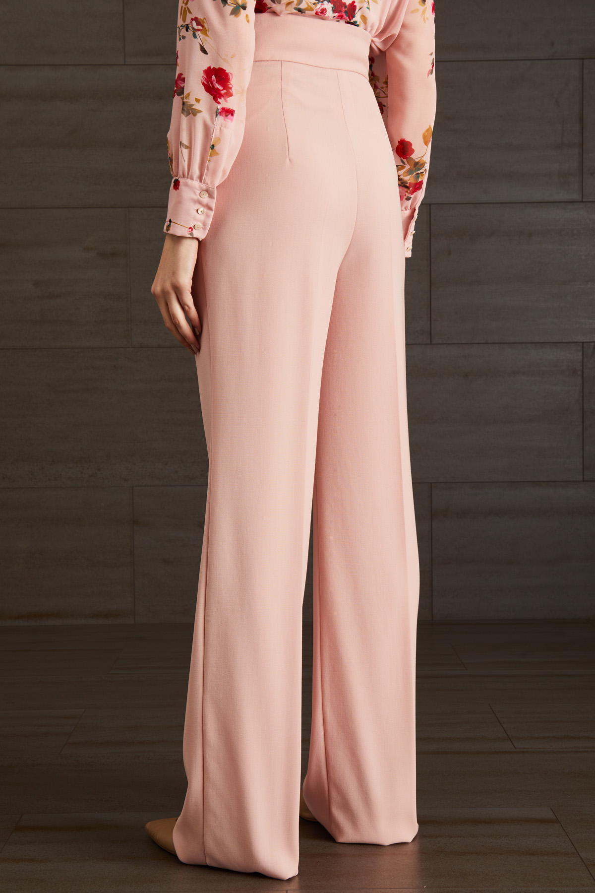 Pantaloni flare a vita alta realizzati in crêpe di pura lana, con cintone in vita, tasche alla francese e pences, profili rifiniti a puntino. Allacciatura nascosta tramite zip, bottone e ganci.
