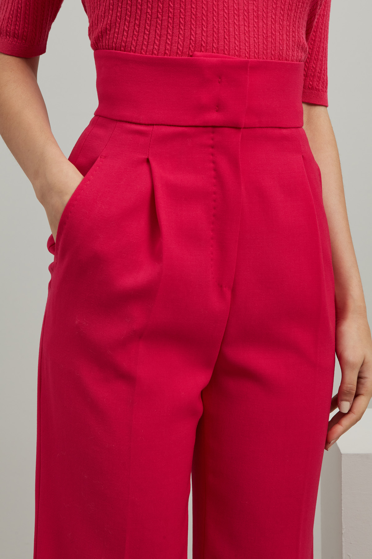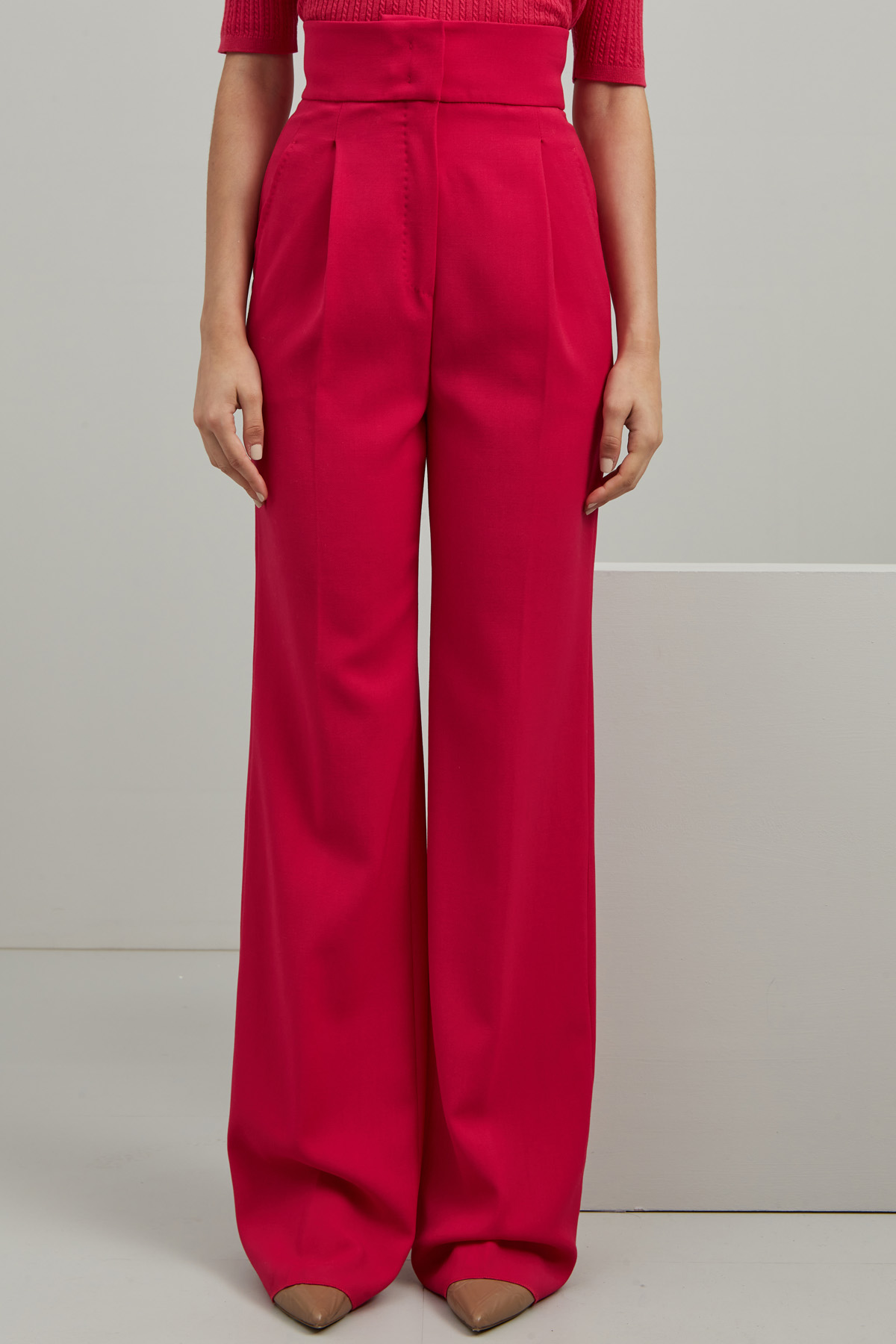 Pantaloni flare a vita alta realizzati in crêpe di pura lana, con cintone in vita, tasche alla francese e pences, profili rifiniti a puntino. Allacciatura nascosta tramite zip, bottone e ganci.