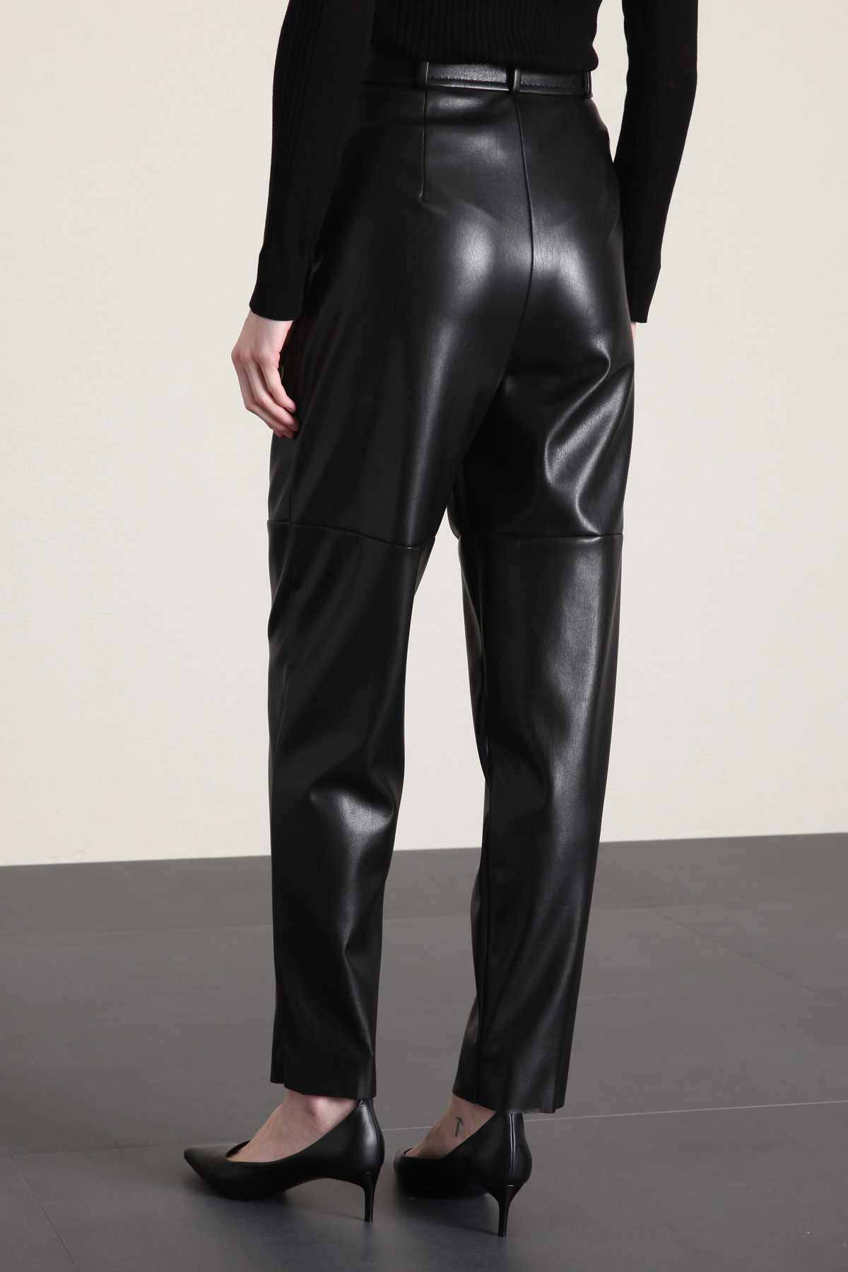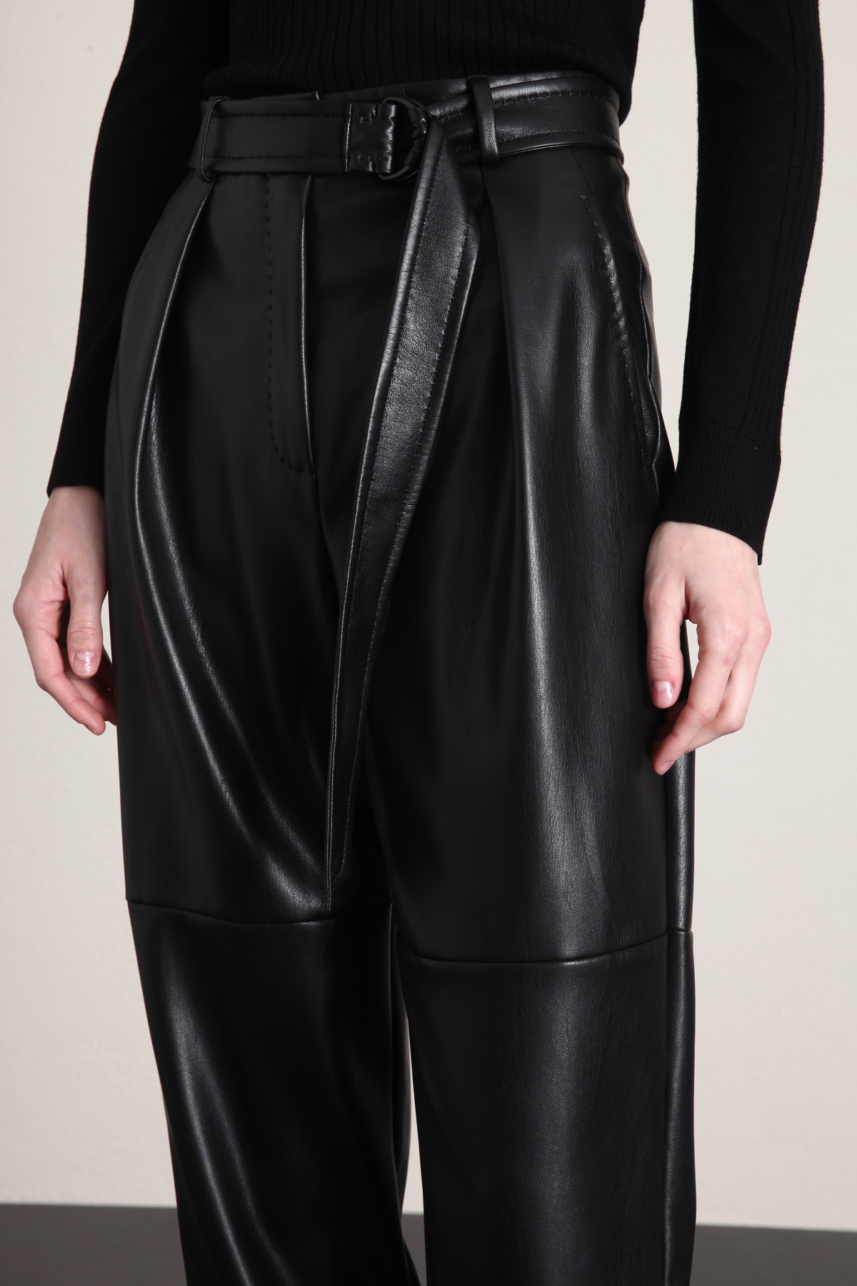 Pantaloni baggy realizzati in jersey spalmato effetto pelle, con rifinitura a puntino in tono, passanti in vita, tasche laterali alla francese e allacciatura nascosta tramite zip, bottone e gancio. Cintura coordinata in similpelle, con fibbia a doppio anello.