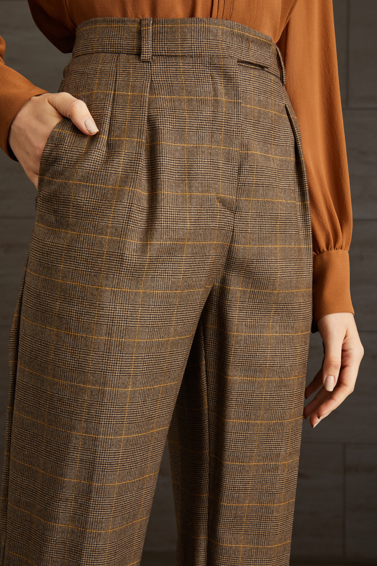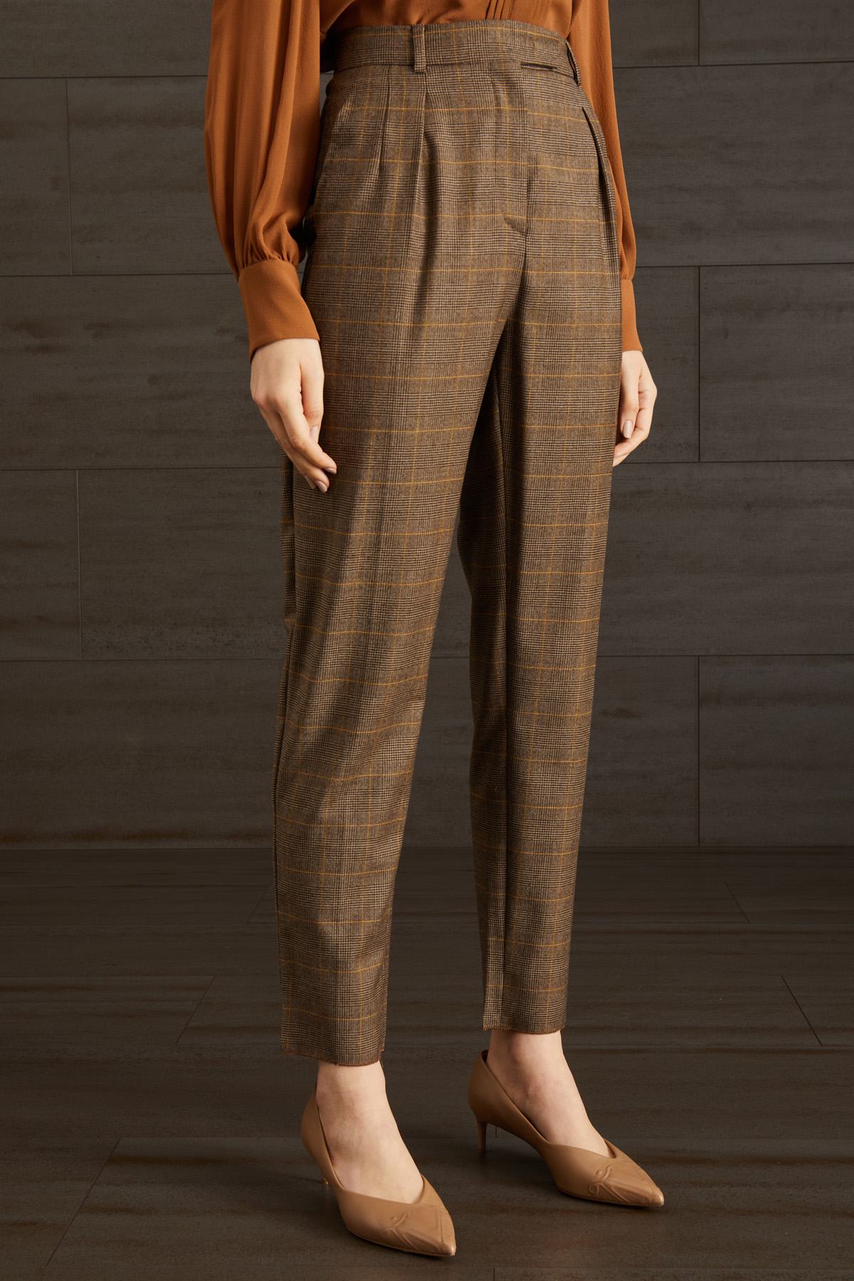 Pantalone carrot realizzati in flanella di pura lana tinto filo, con passanti in vita e piega stirata in lunghezza. Allacciatura nascosta tramite zip, bottone e gancio.